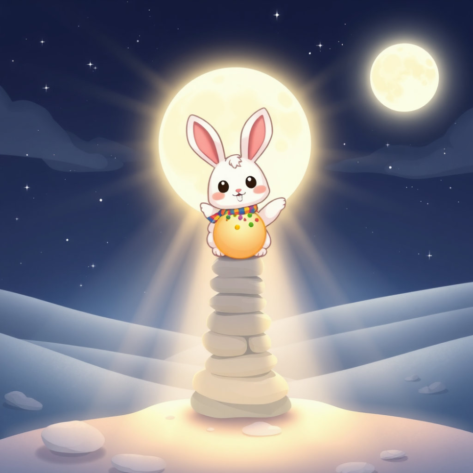 그러던 어느 날 밤, 돌탑 옆에서 ‘쿵, 쿵’ 하는 소리와 함께 달토끼의 웃음소리가 들렸습니다. 달빛은 한층 환하게 돌탑을 감쌌습니다. 그리고 대보름 보름달이 다시 뜬 날, 달에서 빛기둥이 내려왔고, 그 속에서 달토끼가 나타나 복떡을 돌탑 위에 올렸습니다. "정성은 하늘에 닿는단다." 토끼의 따뜻한 목소리가 들렸습니다.