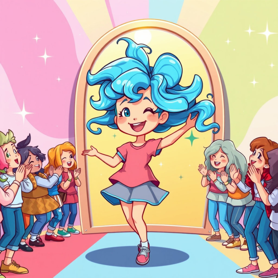 “유리야, 진짜 춤추는 머리 같아!” 친구들이 놀라며 소리쳤습니다. 유리는 거울 앞에서 빙글빙글 돌더니 머리칼이 리듬에 맞춰 춤을 추는 것처럼 흔들렸습니다.