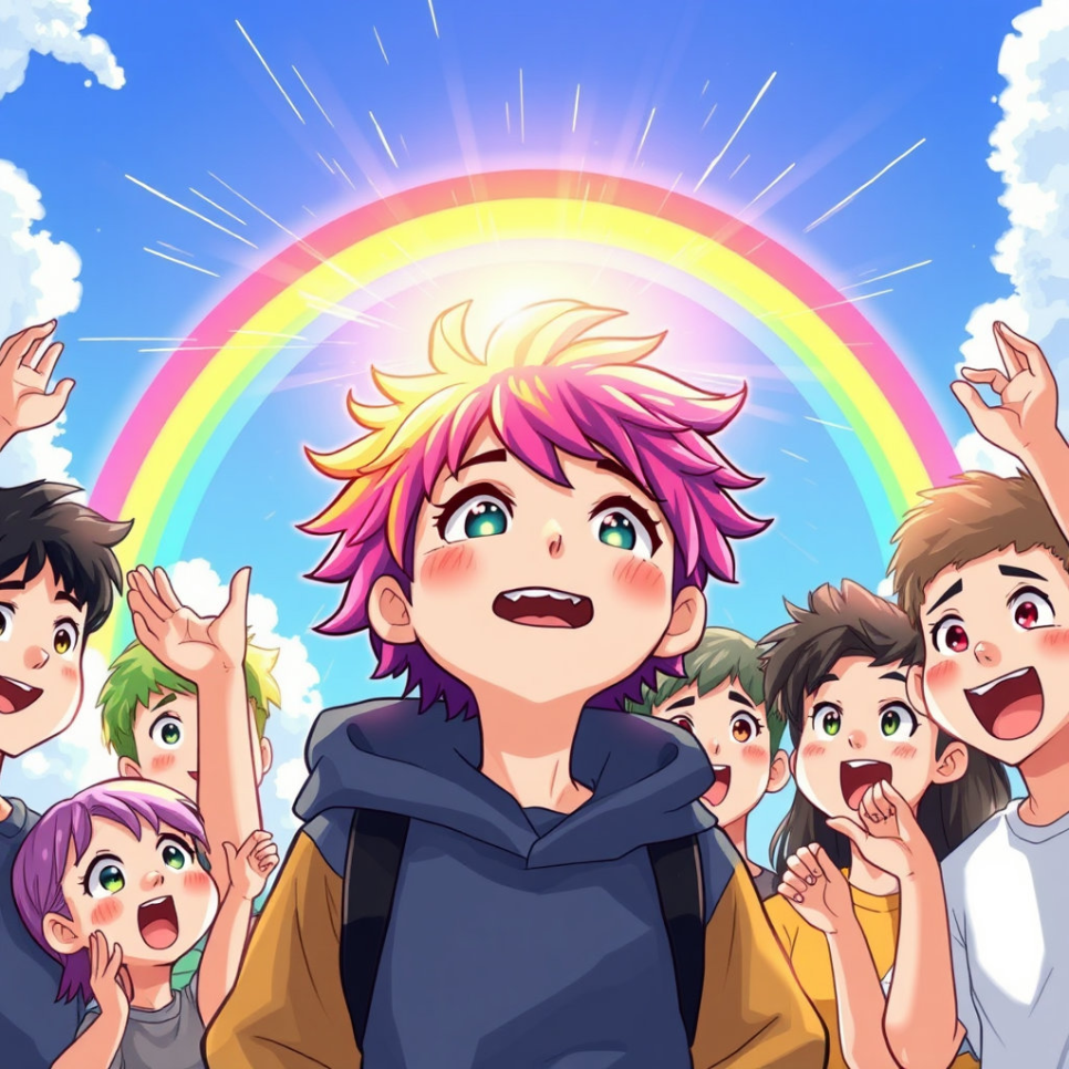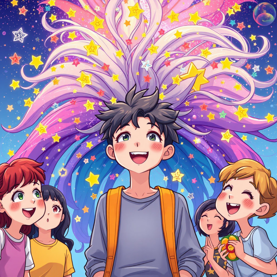 “와, 진짜 무지개 머리다!” 친구들이 감탄했어요. 현우는 머리를 흔들며 마치 무대 위의 주인공처럼 당당하게 섰습니다. 평소 소심했던 현우가 웃으며 말했지요.