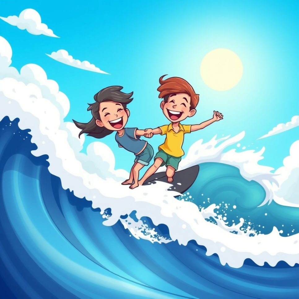 “괜찮아, 함께 하면 무섭지 않아!” 친구들은 서로를 잡고 균형을 맞췄습니다. 파도 위에서 물방울이 튀고, 아이들은 물놀이처럼 즐겁게 흔들림을 경험했어요.