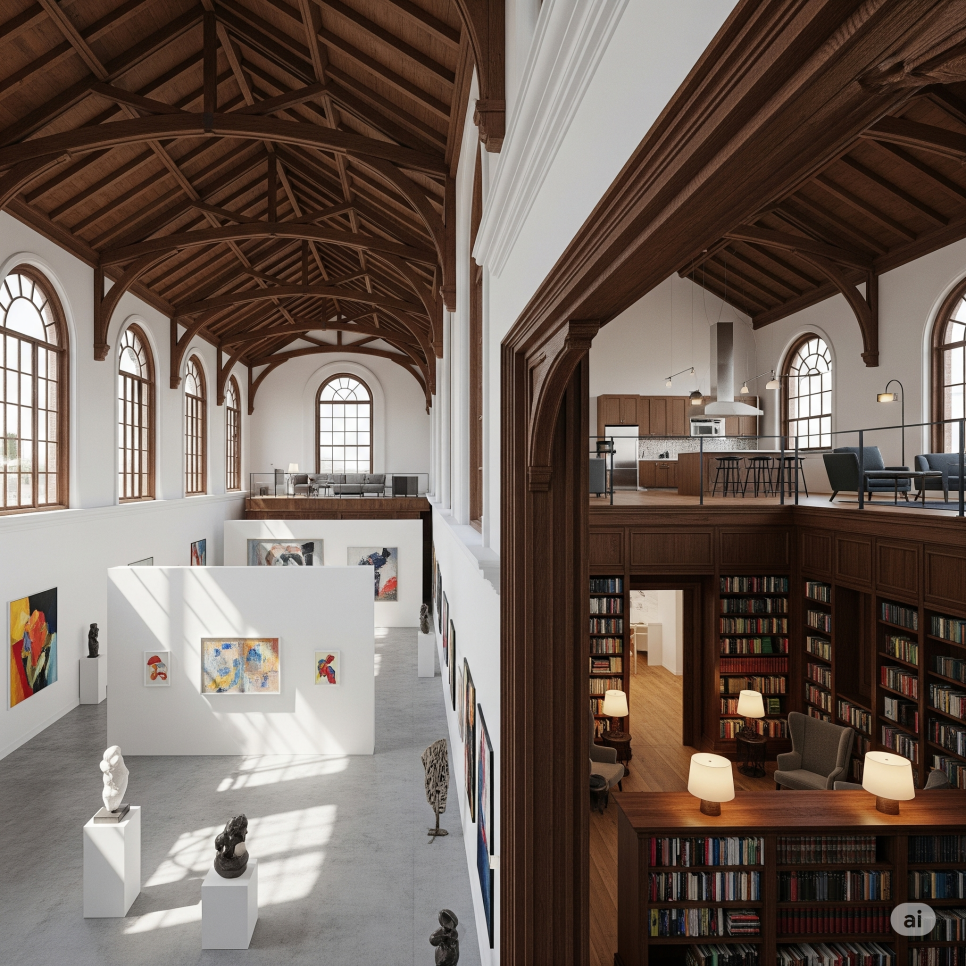 갤러리: 건물 내부의 넓은 공간을 활용하여 작품을 전시할 수 있는 깔끔하고 밝은 갤러리 공간 (예: 화이트 톤 벽면, 적절한 조명)