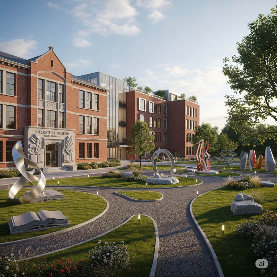 문학관: 폐교 운동장이나 건물 앞쪽에 문학 관련 조형물이나 안내판을 설치하여 문학관임을 나타내는 모습