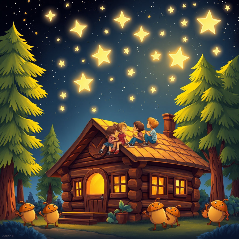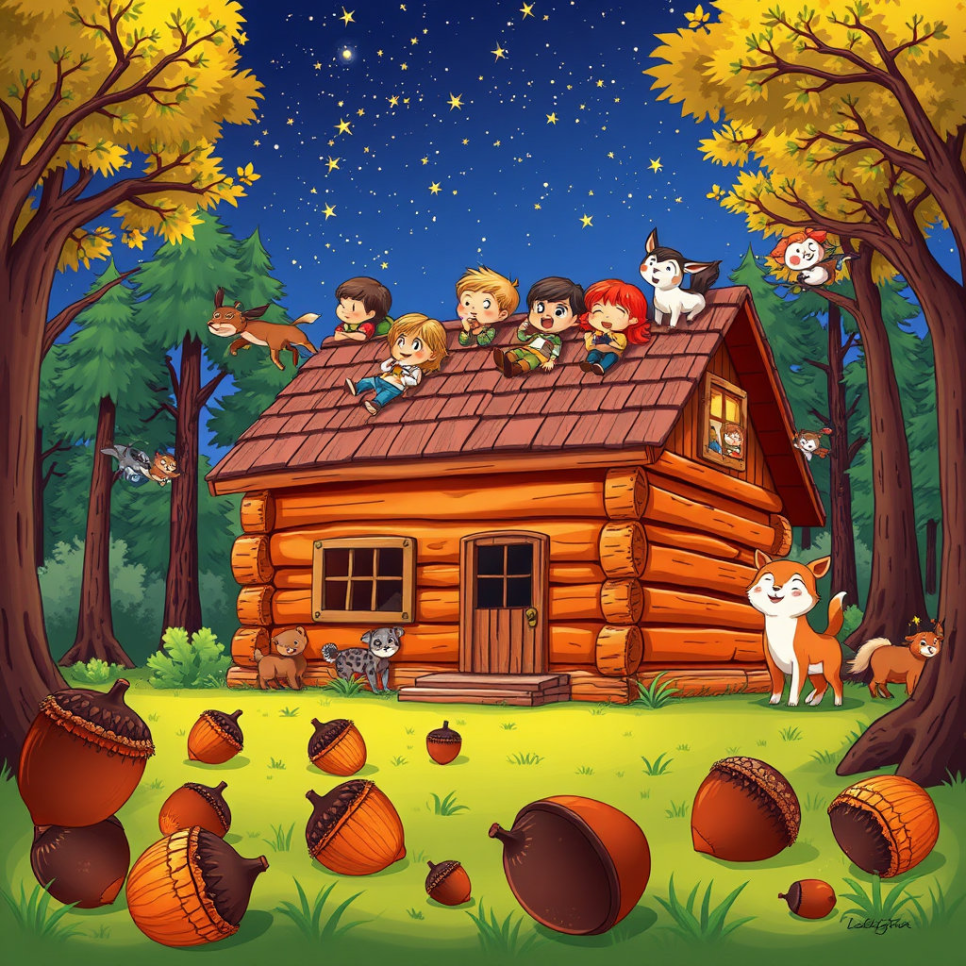 나무들은 자신들이 통나무로 쓰여 아이들이 놀 수 있는 집이 된다는 사실을 알고 조금 긴장하지만, 곧 모두 힘을 합쳐 통나무집을 완성하게 됩니다. 아이들은 통나무집 안에서 숨바꼭질을 하고, 미끄럼틀과 도토리 장난감을 만들며 신나는 시간을 보내죠. 밤이 되면 통나무집 지붕 위로 올라가 반짝이는 도토리별을 바라보며 소원을 빌고, 친구들과 웃음과 행복을 나눕니다.