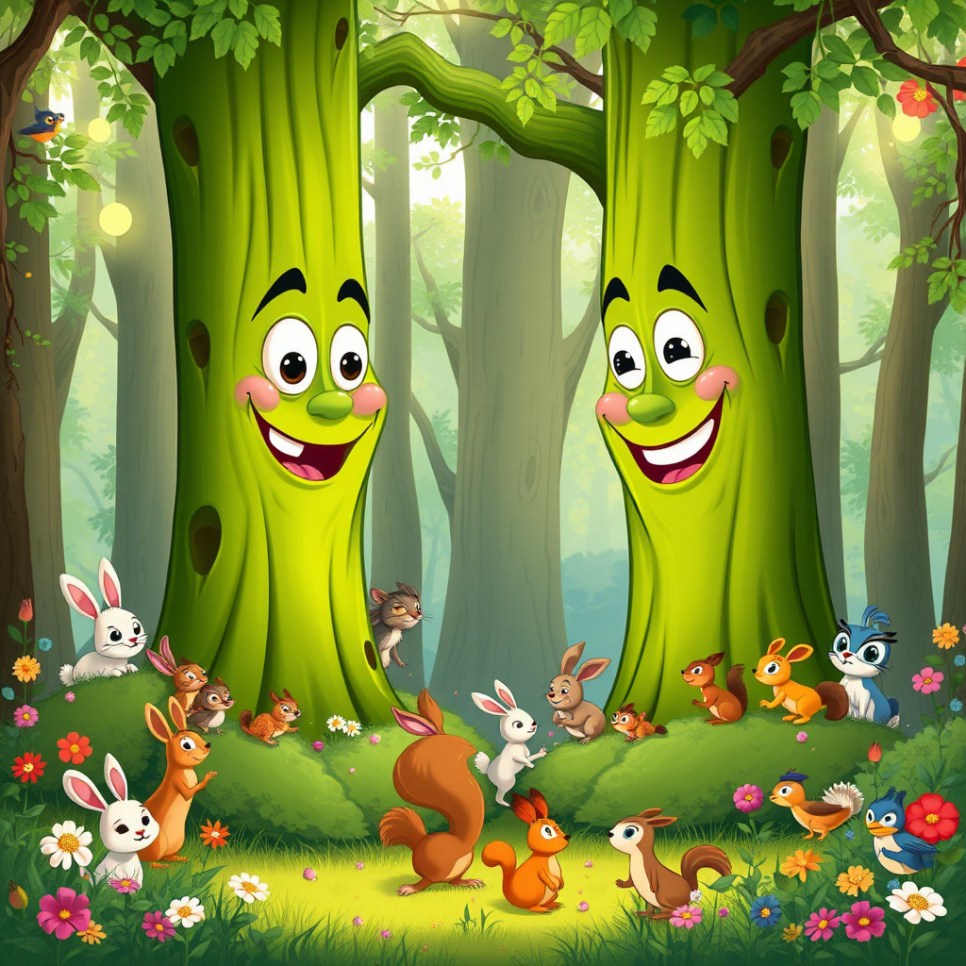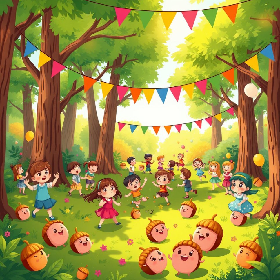 아이들은 도토리로 만든 장난감과 나무로 만든 미끄럼틀에서 뛰놀며 웃었고, 나무들은 웃음꽃을 피우듯 흔들렸답니다.