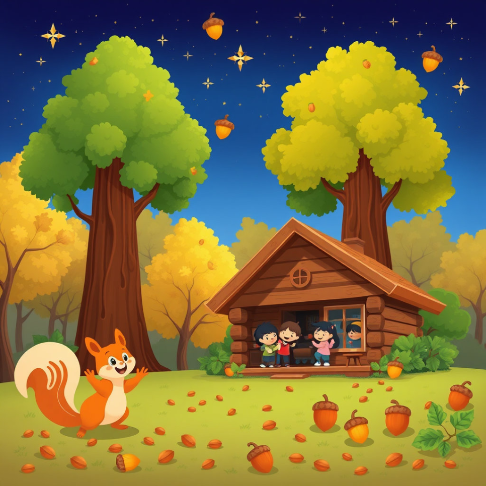 그리고 밤이 되면, 도토리별이 하늘에서 반짝이며 아이들에게 소원을 속삭였답니다.