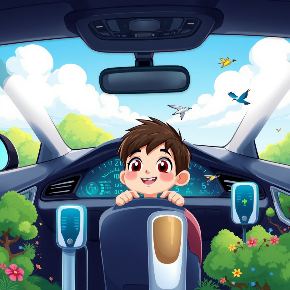 “부릉~ 조용하다!” 지호가 전기차를 타고 시동을 걸자 소리가 거의 나지 않았습니다. 가솔린 차보다 훨씬 조용하고, 환경에도 좋은 전기차의 매력에 지호는 깜짝 놀랐어요. 자동차에 있는 작은 화면으로 배터리 잔량을 확인하고, 충전 스테이션도 배웠답니다. 지호는 “전기로 달리는 차라면 우리 지구를 지킬 수 있겠다!”라며 뿌듯하게 웃었어요.