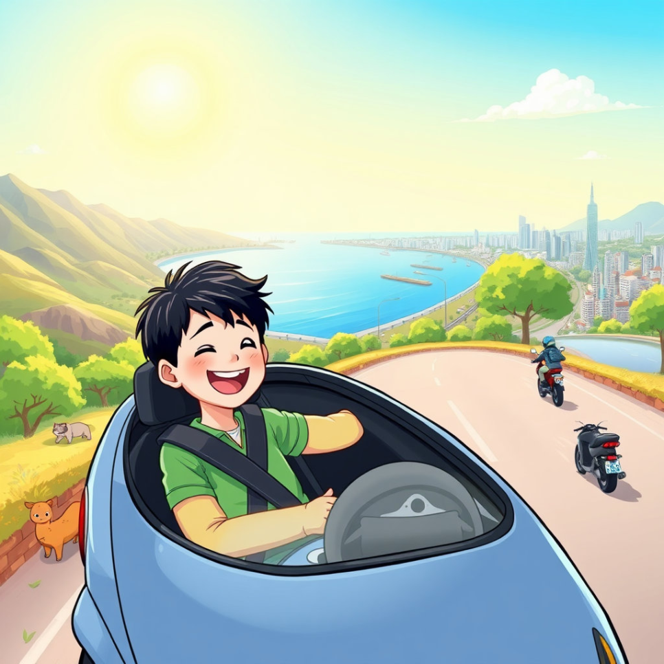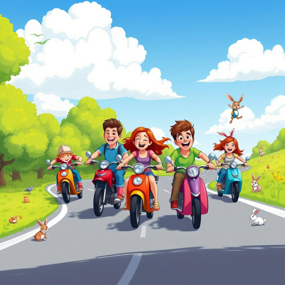지호와 친구들은 배운 것들을 활용해 드라이브 파티를 열었습니다. 1인, 2인 자동차와 오토바이를 모두 타고, 안전하게 도로를 돌며 서로의 모험을 즐겼죠. 하늘에는 해가 반짝이고, 길가에는 웃음이 가득했어요. 지호는 “운전은 재미있지만 안전이 제일 중요해!”라며 배운 것을 마음에 새겼답니다.