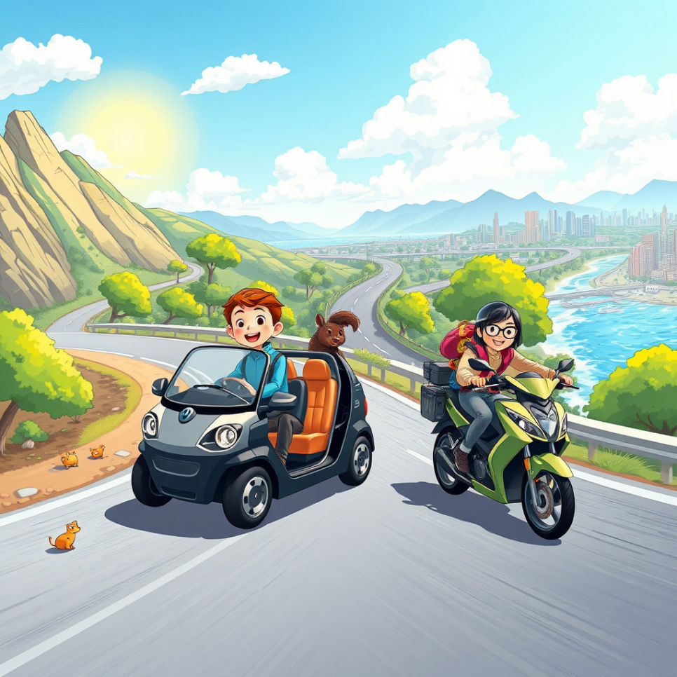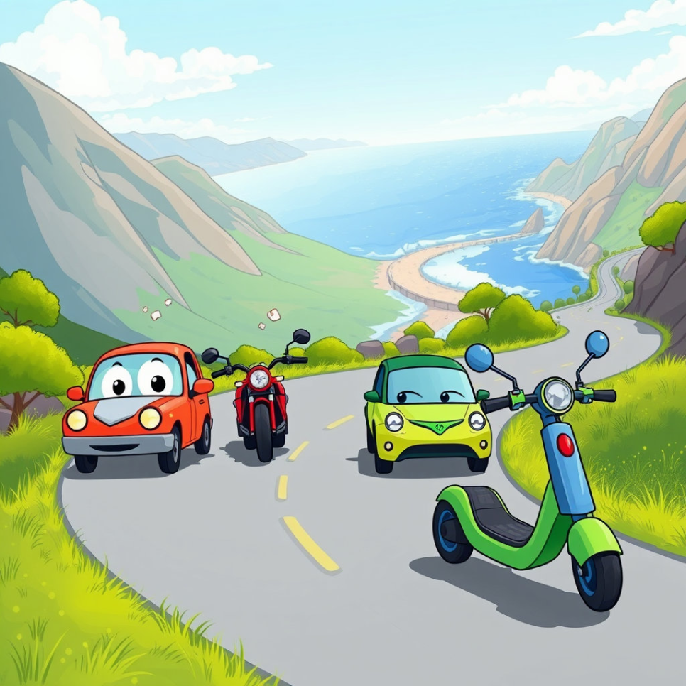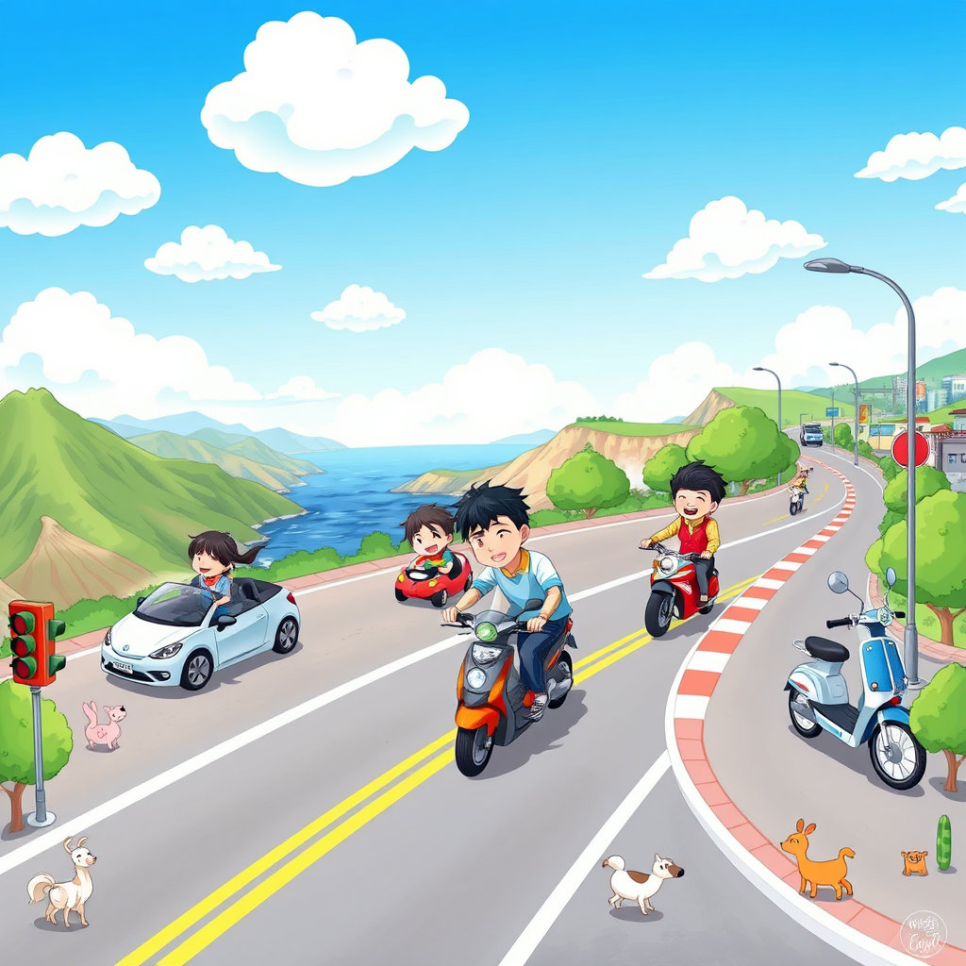 지호는 이번에는 산길과 바닷길을 달렸습니다. 산길은 굽이굽이 올라가며 조심해야 했고, 바닷길은 시원한 바람과 파도 소리가 함께했어요. 전기차와 오토바이 모두 자연 속에서 달리며 새로운 경험을 느꼈죠. “자연 속 드라이브는 마음까지 시원하게 해주네!” 지호는 행복하게 소리쳤습니다.