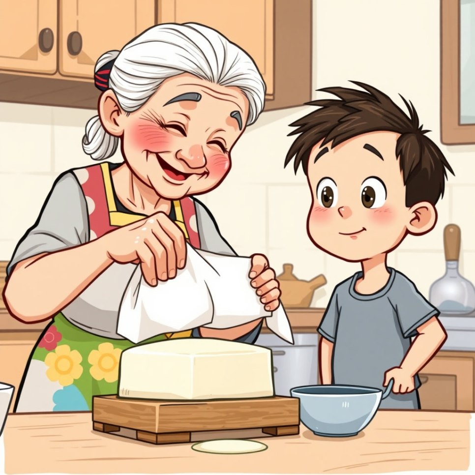할머니는 종종 두부를 직접 만드셨어요. 커다란 솥에서 콩을 삶아 갈고, 하얀 천으로 콩물을 짜낼 때, 부엌은 고소한 향기로 가득했지요.
