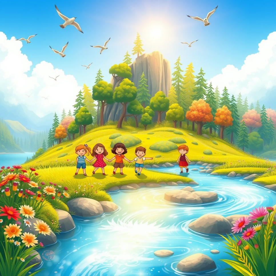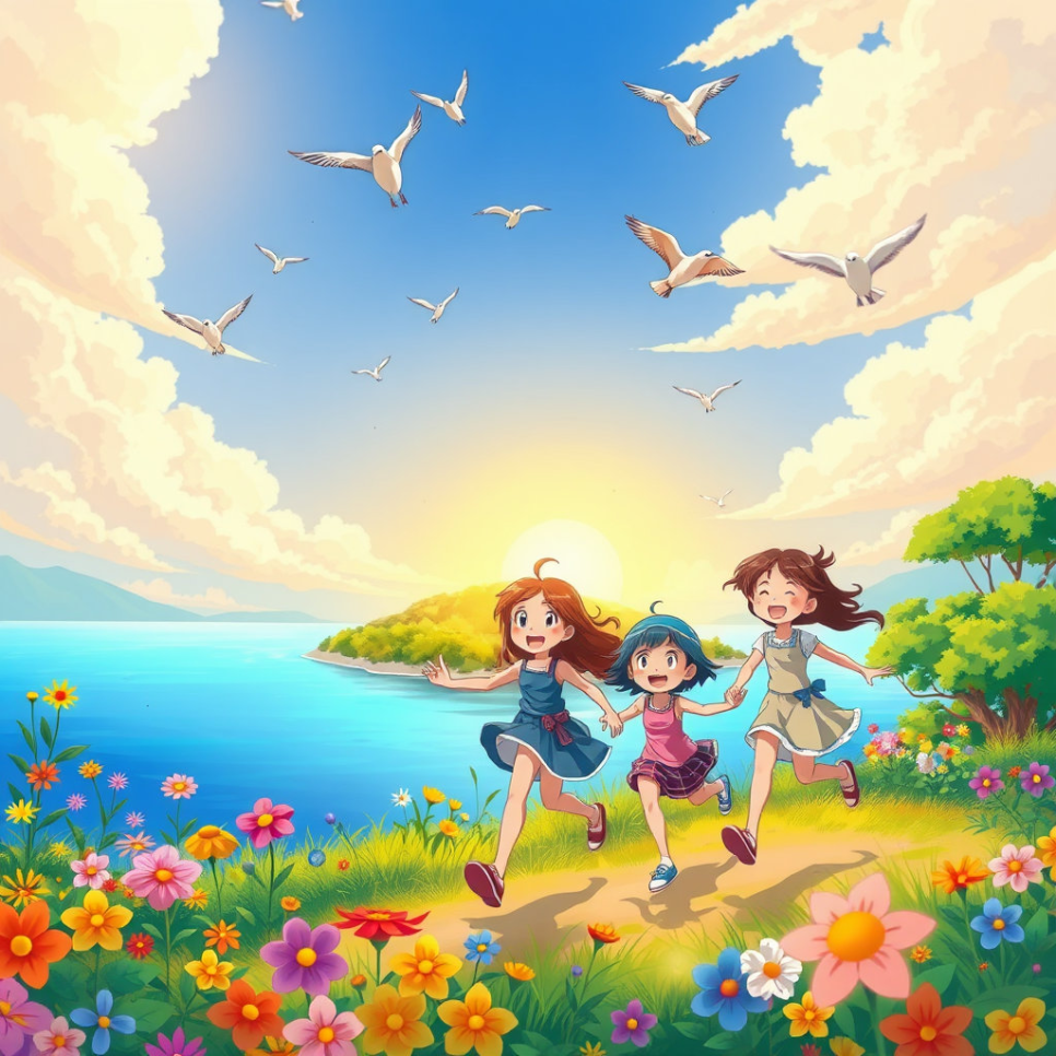 섬에는 푸른 바다와 끝없이 펼쳐진 숲, 그리고 알록달록 꽃들이 가득했다. 아이들은 바람을 가르며 뛰놀고, 새들은 노래를 불렀다. 마을 사람들은 서로를 돕고, 작은 시장에서는 신선한 과일과 물고기가 오갔다. 섬의 하루는 언제나 햇살과 웃음으로 시작했다. 평화로운 섬의 모습은 마치 그림책 속 한 장면처럼 따뜻했다. 아이 ‘유키’는 강가에서 친구들과 모래성을 쌓으며, “이 섬은 우리 모두의 보물!”이라고 외쳤다.