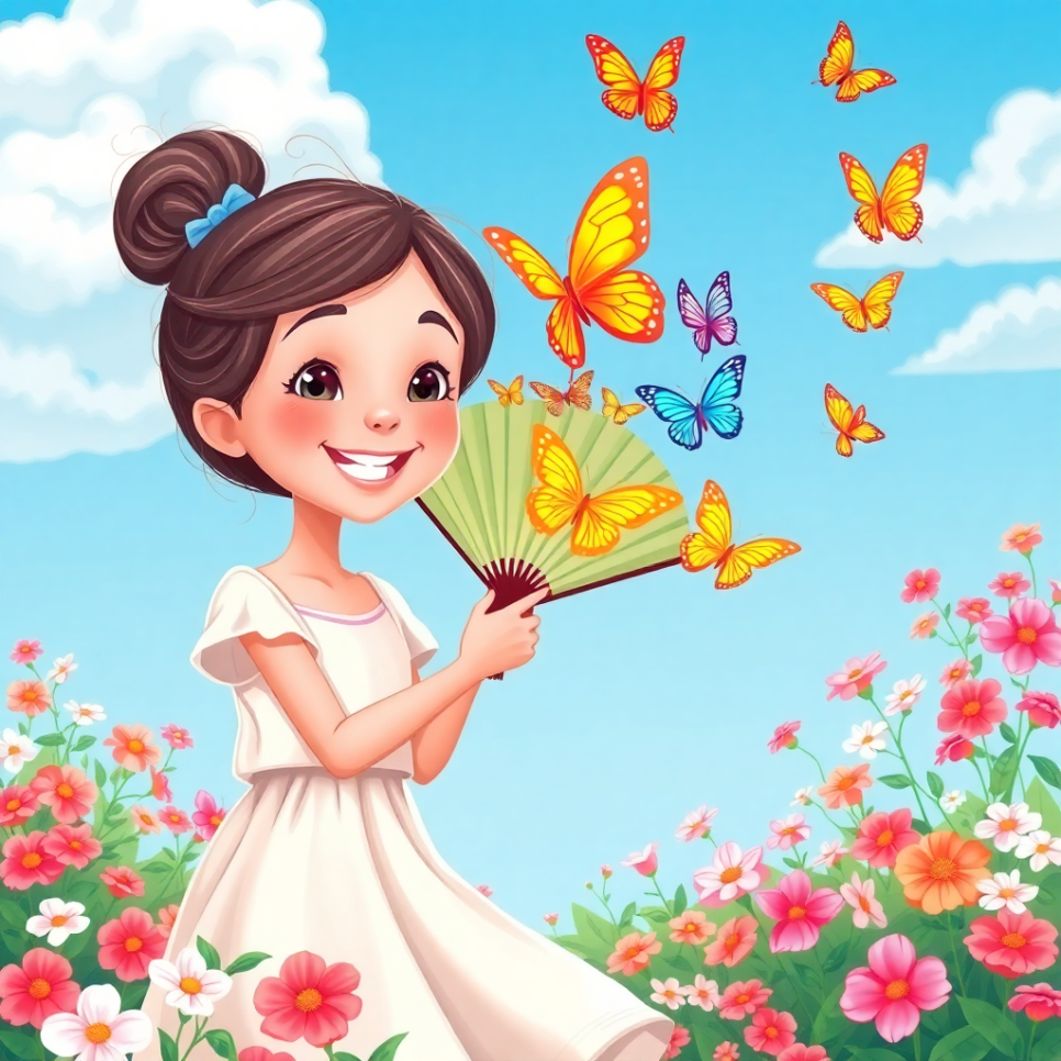 소녀가 부채를 손끝으로 가볍게 흔들자, 나비들이 날아오르는 듯했어요. 부채 끝은 나비의 날개처럼 팔랑팔랑 흔들리며 아이들의 마음을 간질였지요. 바람을 따라 춤추는 나비는 아이들의 상상 속에서 꽃밭 위를 자유롭게 날아다녔답니다.
