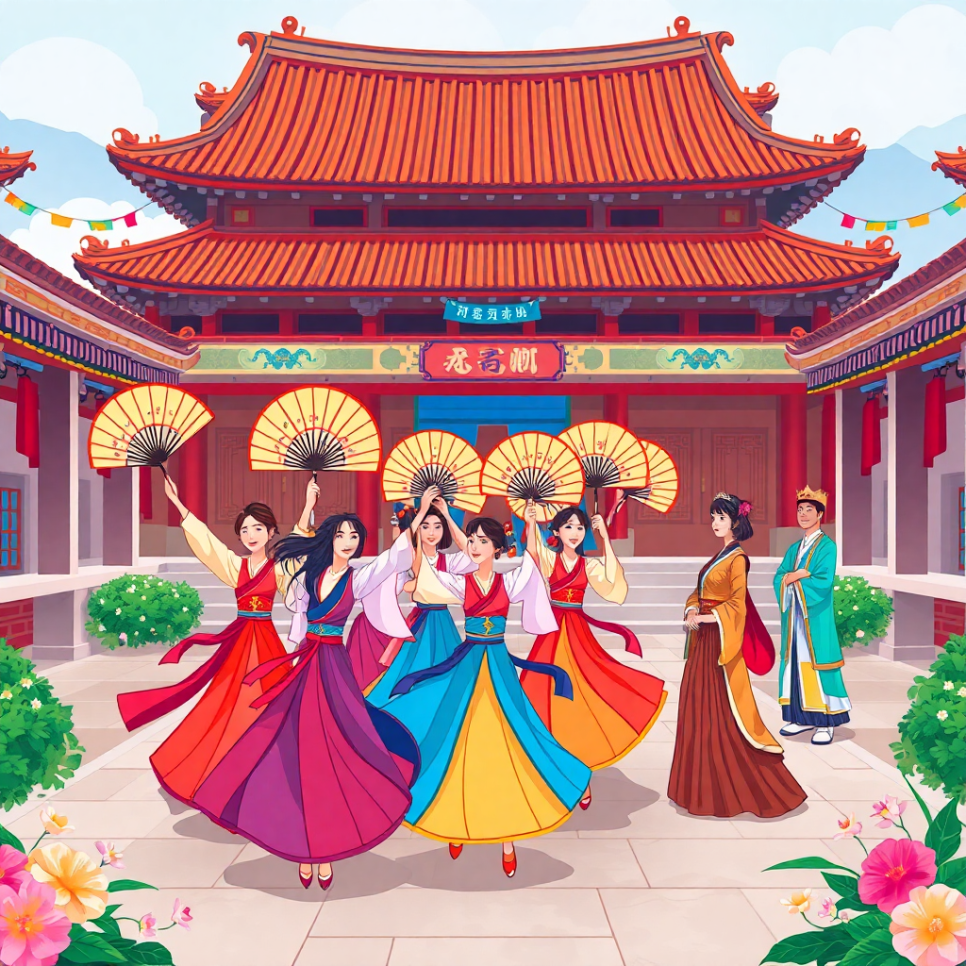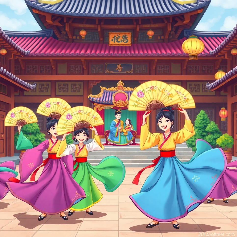 옛날 궁궐에서는 왕과 왕비가 앉아 부채춤을 보았어요. 무용수들이 고운 한복을 입고 부채를 흔들면 궁궐 뜰은 꽃밭으로 변했지요. 왕과 왕비는 “저 춤은 참으로 고우다” 하며 미소를 지었답니다.