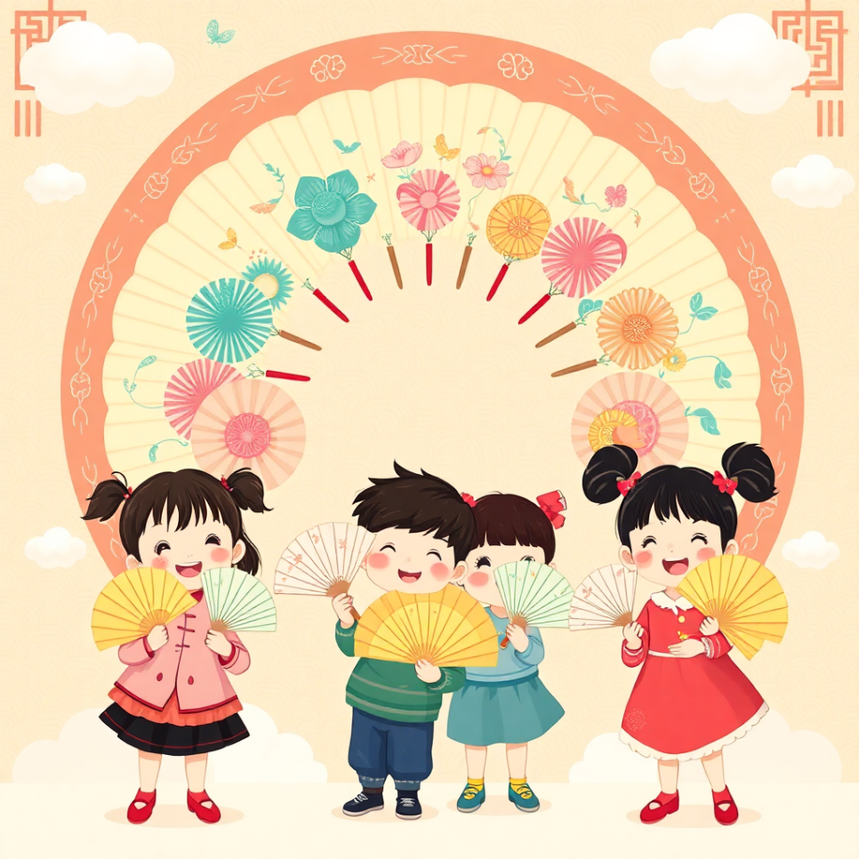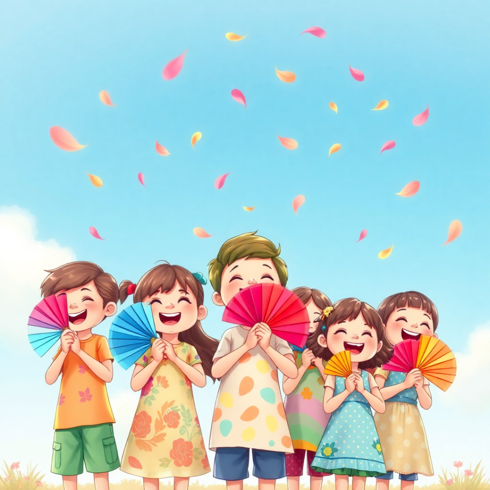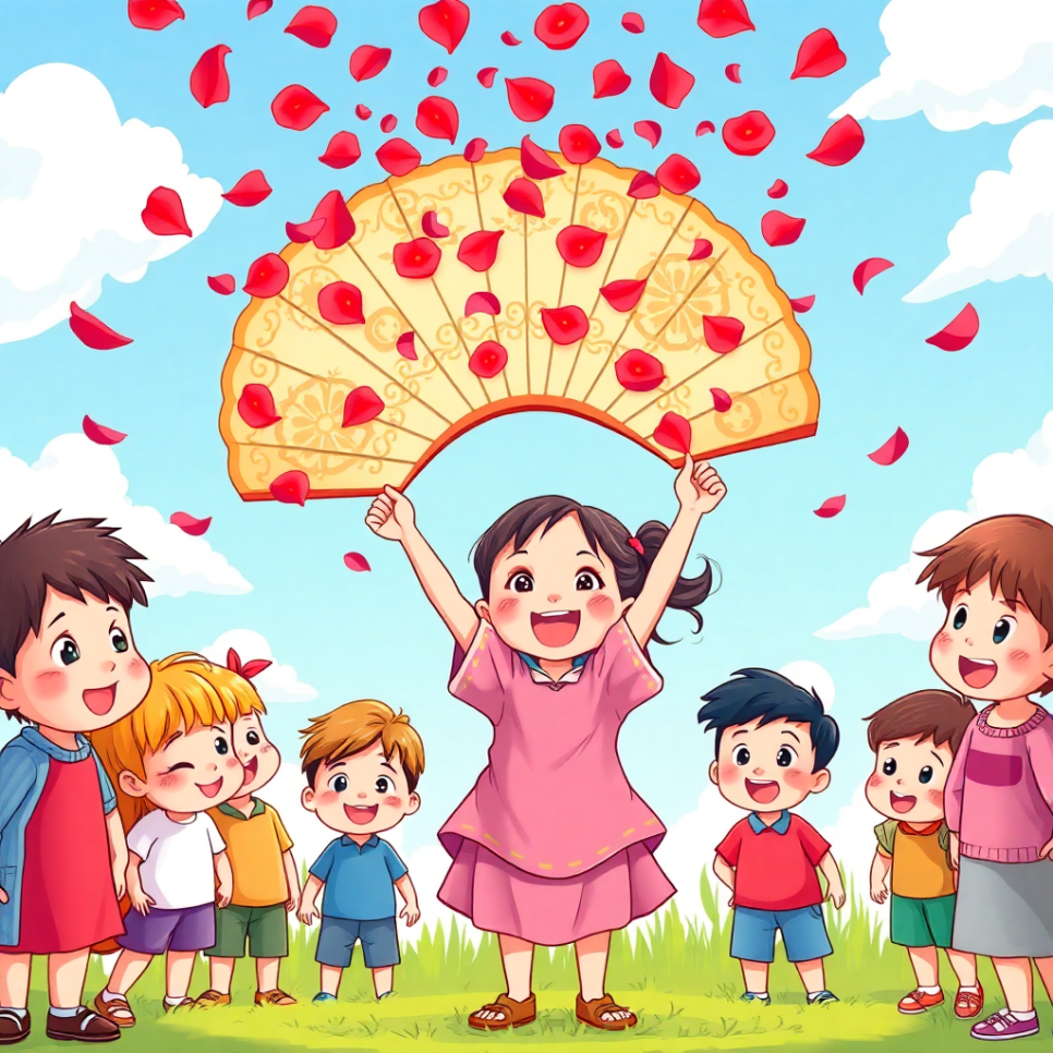 마지막 춤이 끝났을 때, 아이들은 부채춤을 마음속에 새겼어요. “우리도 이렇게 고운 마음으로 살아야지.” 부채는 닫혔지만, 아이들의 가슴 속에는 언제나 꽃바람이 피어 있었답니다.