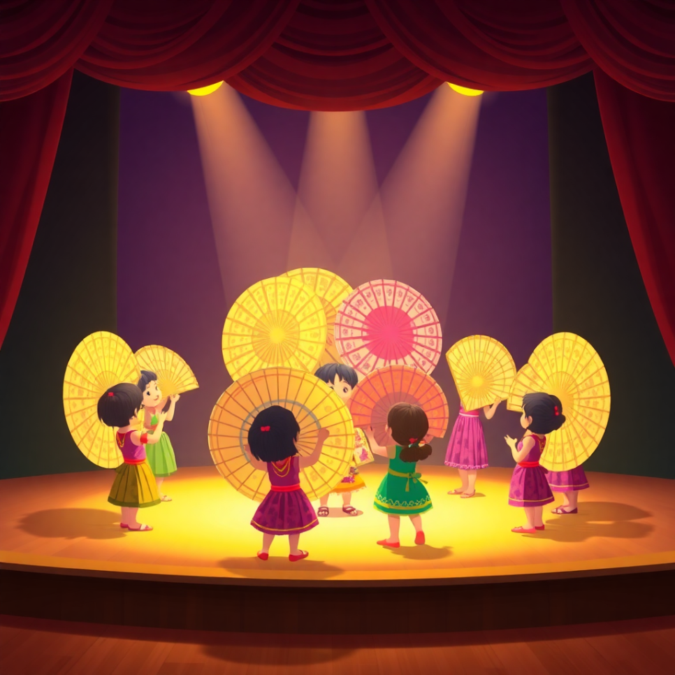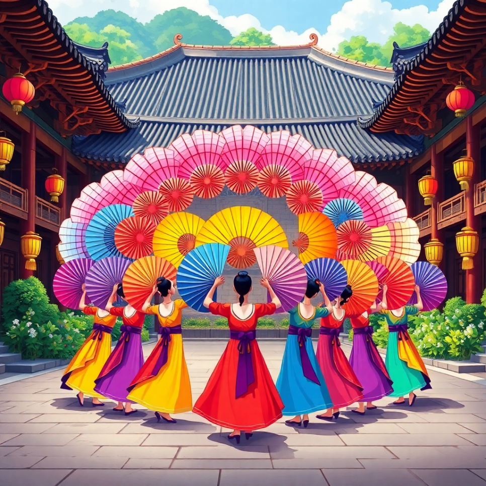 무용수들이 둥글게 서서 동시에 부채를 펼쳤어요. 순간, 무대 위에 커다란 꽃 한 송이가 피어난 것처럼 보였지요. 아이들은 입을 다물지 못한 채 바라보다가 “와, 진짜 꽃이다!” 하고 외쳤답니다.