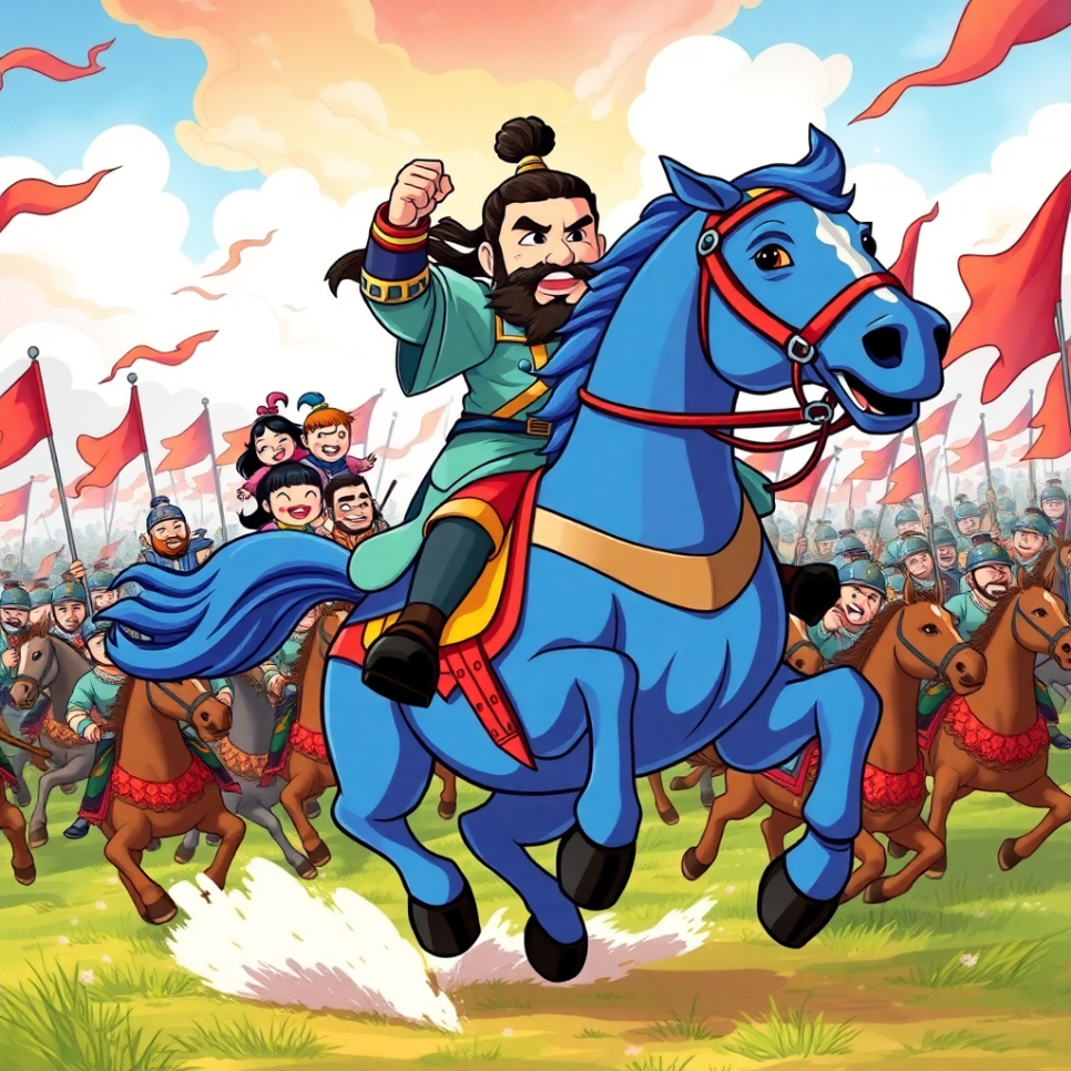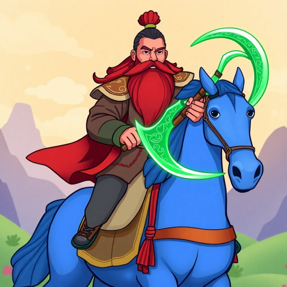적들과의 전투가 시작되었어요. 관우는 붉은 말을 타고 적진을 휘젓듯 달렸죠. 한 손엔 청룡언월도를 들고, 다른 손으론 동료를 지켰어요. 적들도 그 용맹함에 놀라 뒷걸음질쳤답니다. 전쟁이 끝난 후, 백성들은 말했어요. "우리 마을을 지켜줘서 고마워요, 수염 장군님!" 관우는 미소 지으며 대답했어요. "백성을 위한 싸움이 가장 가치 있어요."