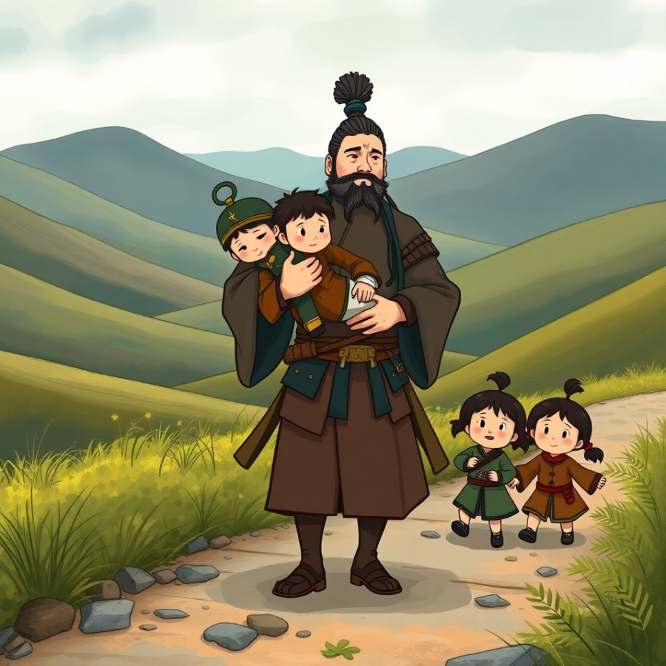 어느 날, 적군이 유비의 가족을 잡아갔어요. 관우는 그들을 지키기 위해 적진으로 갔죠. 그곳에서 관우는 조조라는 대장에게 잠시 붙잡혀 있었지만, 마음속에는 오직 하나, 형님 가족을 지켜야 한다는 생각뿐이었어요. 결국 그는 수많은 관문을 지나며 길을 뚫고 백 마일을 달려 형님의 가족을 안전하게 데려왔어요. 모두가 말했어요. "관우는 약속을 지킨 진짜 영웅이야!"