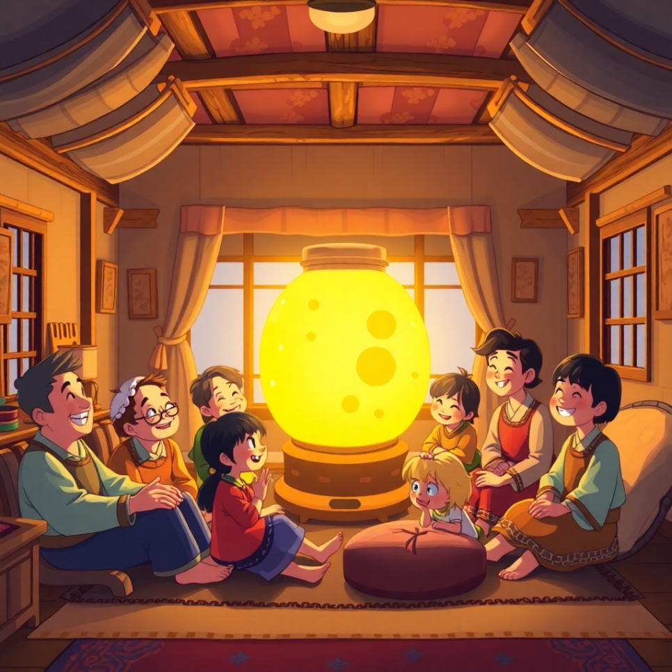 마침내 완성된 달항아리는 마을 어른의 집 안방에 놓였어요. 흰 빛이 방 안 가득 퍼지자 사람들은 모두 환하게 웃었지요. 아이들은 항아리 앞에 앉아 이야기했어요. “마치 달님이 우리 곁에 있는 것 같아!” 그날부터 달항아리는 마을의 자랑이 되었고, 사람들의 마음을 하나로 이어 주었답니다.
