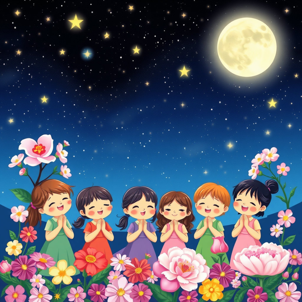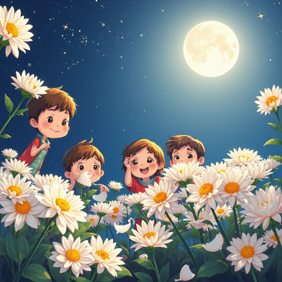 가을밤, 달빛 아래 국화꽃이 은은히 피어났어요. 국화는 향기로운 냄새를 퍼뜨리며 달님과 잔치를 벌였지요. 아이들은 국화 향기를 맡으며 “이건 마음을 맑게 해주는 꽃이야!” 하고 외쳤어요. 국화는 아이들에게 마음을 깨끗이 하고 바르게 살아가야 한다는 것을 가르쳐 주었답니다.