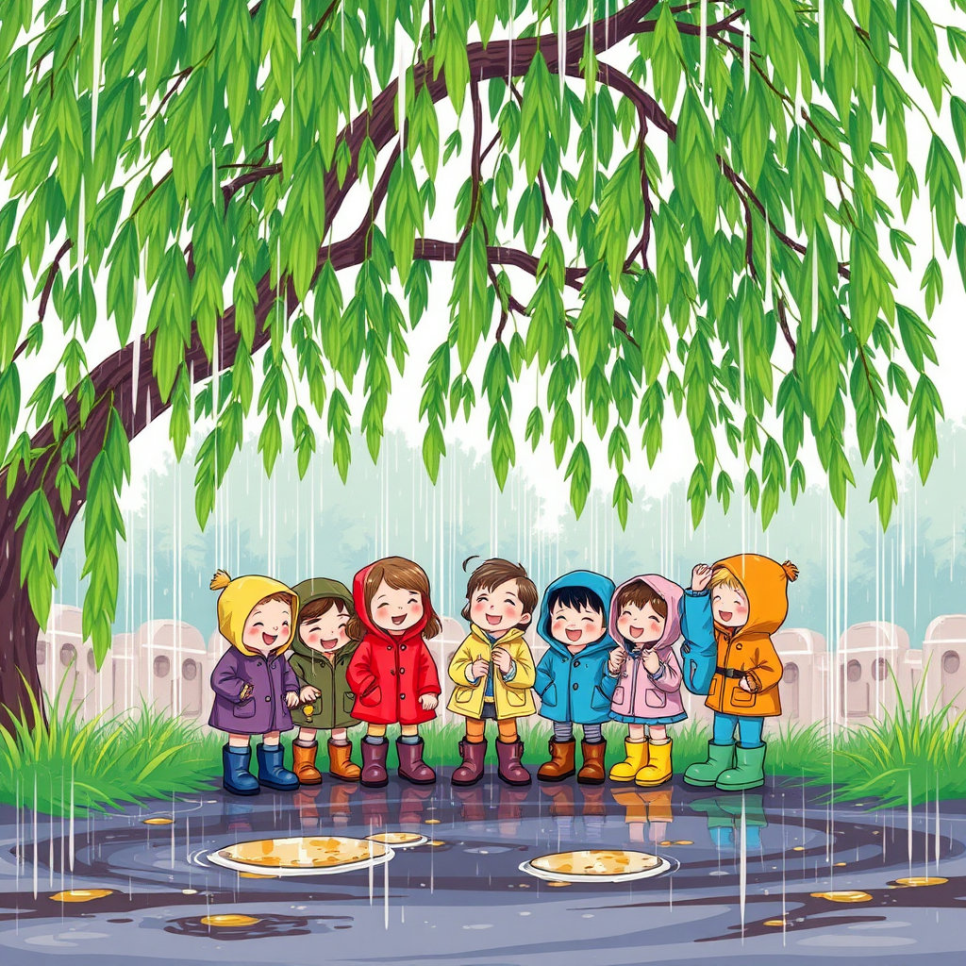 봄비가 내리면 버드나무는 가지를 길게 늘어뜨리며 춤을 췄어요. 빗방울은 버들잎에 맺혀 반짝반짝 보석처럼 빛났지요. 아이들은 버드나무 아래 모여 비 맞기를 즐겼어요. 버드나무는 그들에게 말했어요.