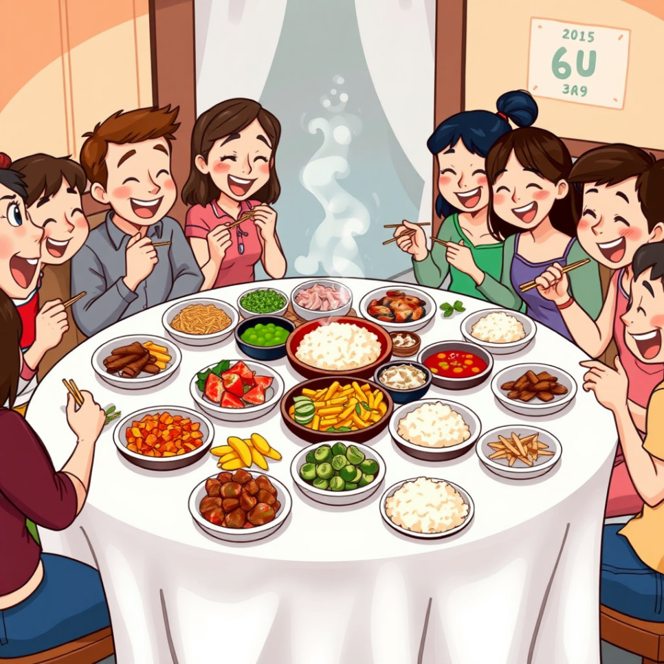 저녁이 되자 한국 집에 초대받았어요. 밥상 위엔 밥과 국, 그리고 가지런히 놓인 여러 반찬이 있었지요. “와, 음식이 이렇게 많아?” 하늘나라 친구들이 눈을 반짝였어요. 자기 나라에서는 보통 한 접시에 메인 음식만 있거든요. 한국은 함께 나누어 먹으며 정을 나누는 식탁 문화가 있었어요.