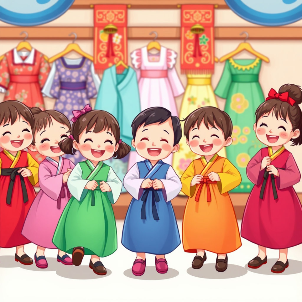 다음 날, 마을에서 전통 의상 체험이 열렸어요. 한국 친구는 곱디고운 한복을 입었지요. 곡선이 살아 있는 고운 색깔이 햇빛에 반짝였어요. 친구들은 일본 기모노나 서양 드레스와도 다르다는 걸 알았답니다. 한복은 편안하면서도 우아했지요. “옷에도 나라의 마음이 담겨 있구나!” 친구들은 신기했어요.