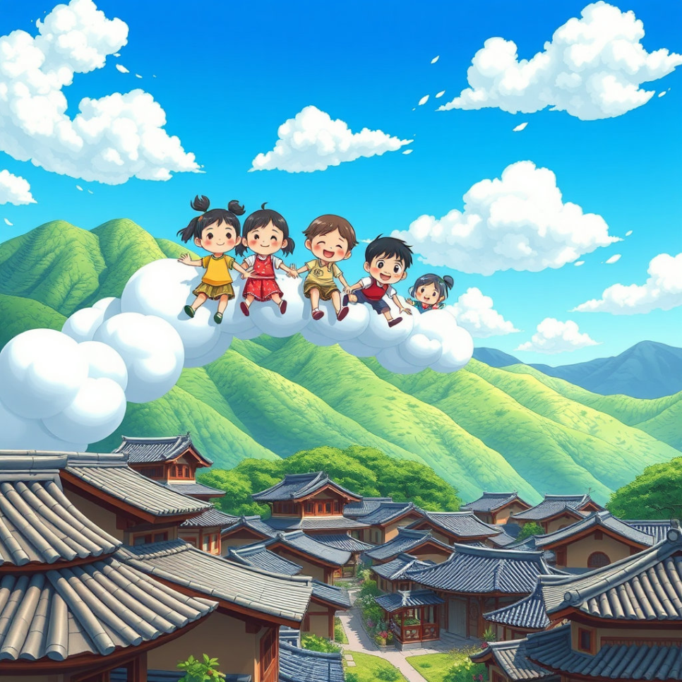 모험의 마지막 날, 친구들은 구름다리를 따라 다시 하늘나라로 돌아갔습니다. 그들은 마음속에 ‘인사’, ‘밥상’, ‘옷’, ‘온돌’, ‘정’, ‘명절’, ‘놀이’, ‘한옥’으로 이어지는 특별한 보물들을 간직했지요. “문화는 다르지만, 서로 존중하고 마음을 나누는 건 어디서나 같아!” 친구들의 목소리는 환하게 빛나며 하늘 위로 퍼져나갔습니다.