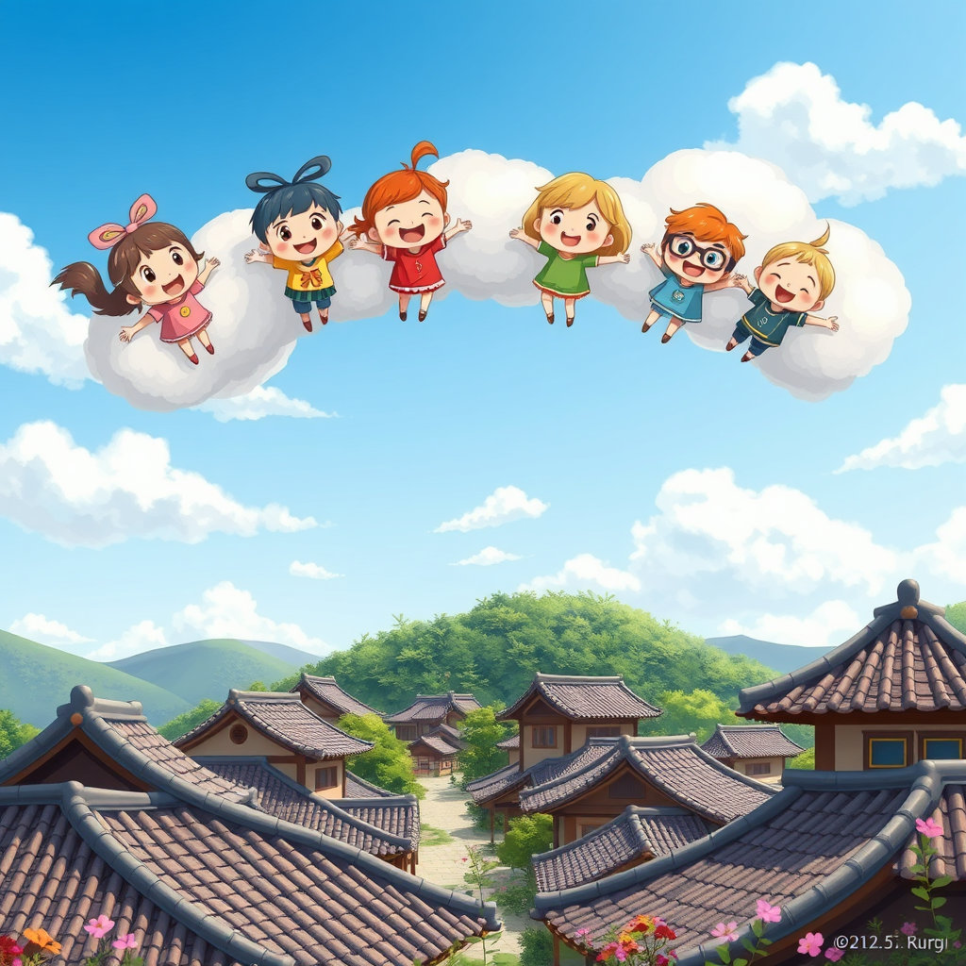 구름 위 하늘나라에 살던 다섯 친구가 있었어요. 그들은 지구 여러 나라를 여행하며 문화를 배우는 특별한 임무를 맡았지요. 어느 날, 반짝이는 구름다리를 따라 내려오자 푸른 산과 강이 펼쳐진 낯선 땅이 보였어요. 바로 ‘한국’이었답니다. “여기는 어떤 문화가 있을까?” 친구들은 두근두근 설레는 마음으로 모험을 시작했어요.