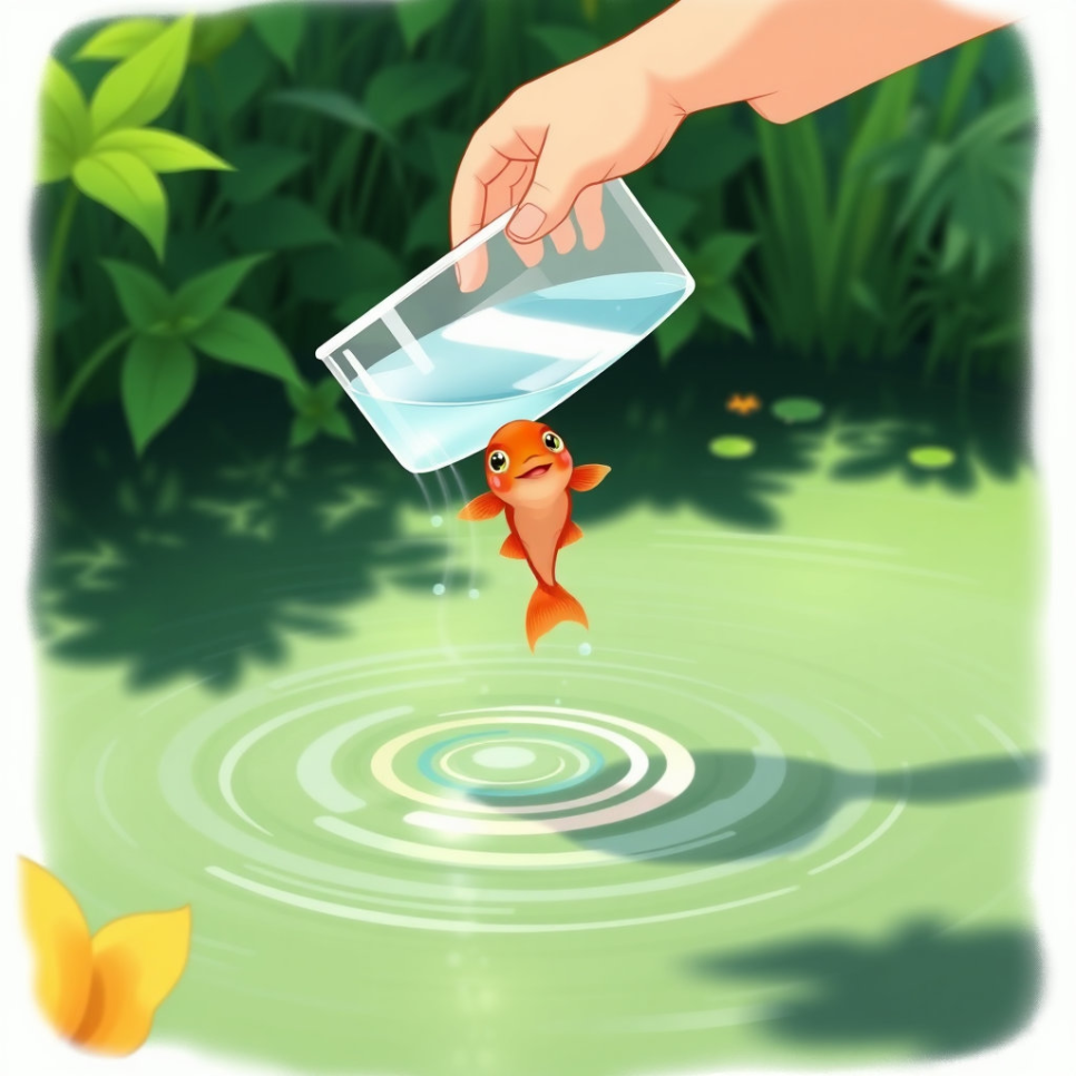 잠시 후, 그 사람은 붉은 물고기가 담긴 물통을 들고 다시 연못가로 돌아왔어요. 그리고 조심스럽게 물통을 기울여 붉은 물고기를 연못 속으로 다시 보내주었죠. 바로 물고기 방생이라는 생명존중의 마음이 붉은 물고기를 구한 거예요. 붉은 물고기는 연못의 시원한 물을 다시 느끼며 "내가 살았구나!" 하고 기뻐했습니다. 친구들이 모두 잡혀갔을 때 혼자 남겨졌던 붉은 물고기는 다시 돌아온 행운에 깜짝 놀랐습니다.