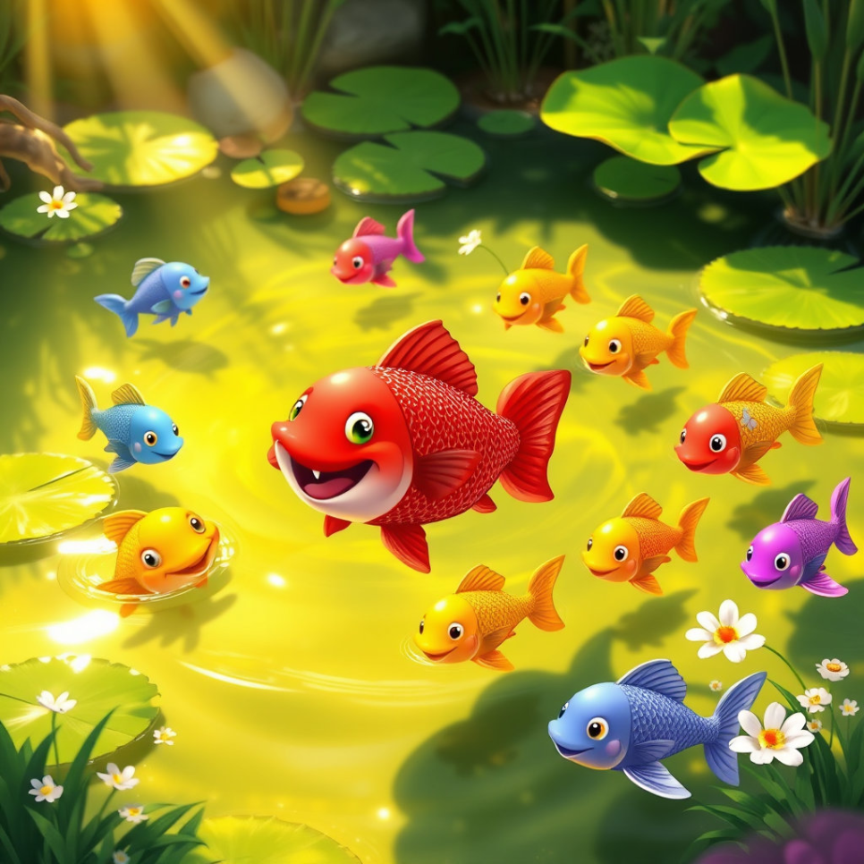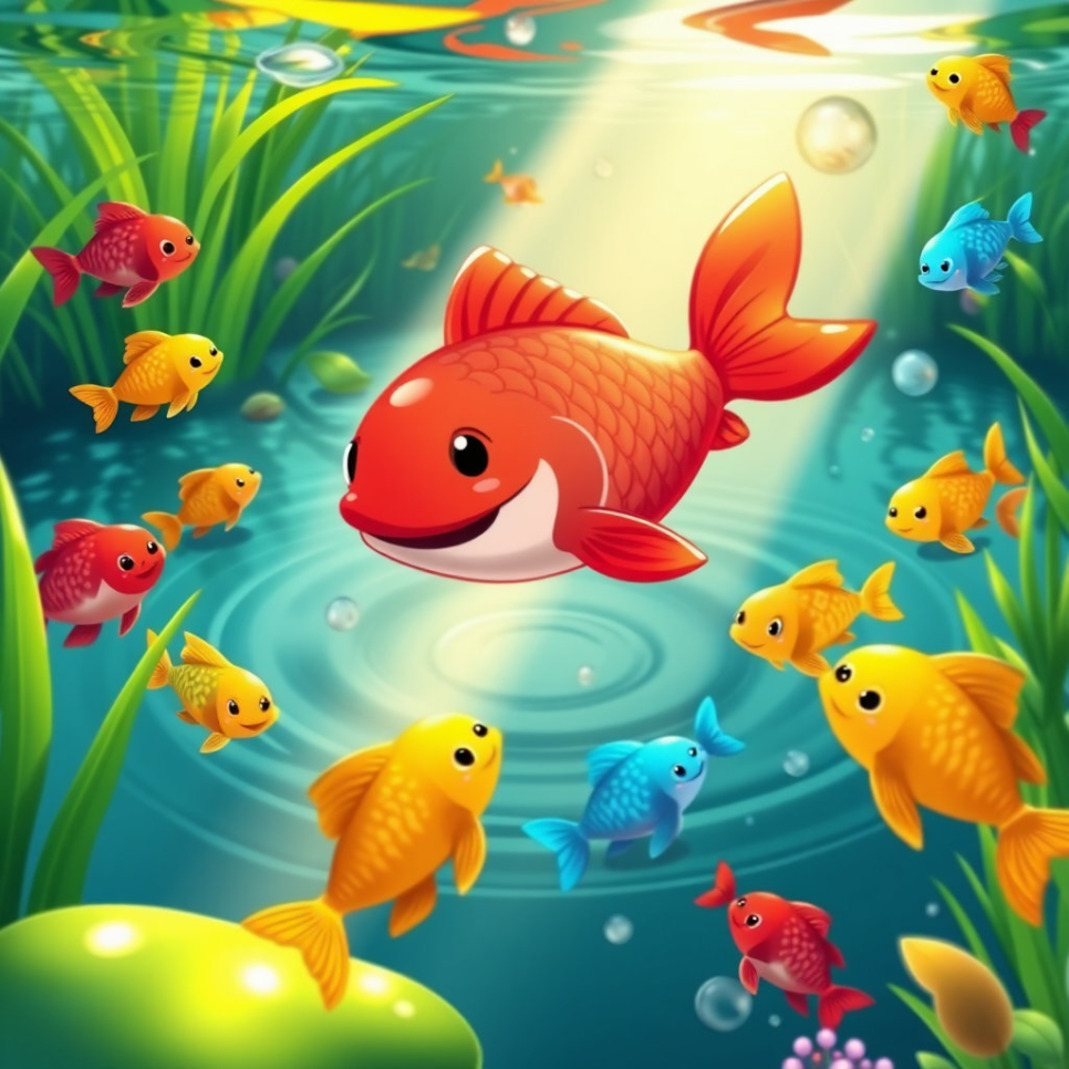 붉은 물고기의 따뜻한 마음과 이야기는 연못에 행복의 물결을 퍼뜨렸어요. 서로를 낯설어하던 물고기들이 함께 모여 놀고, 맛있는 먹이를 나누어 먹으며 웃음꽃을 피웠죠. 연못은 활기로 가득 찼고, 붉은 물고기는 더 이상 외롭지 않았습니다. 친구들은 붉은 물고기의 열정과 힘을 보며 작은 도전을 시작했죠. "우리도 해보자!" "함께라면 뭐든지 할 수 있을 거야!"
