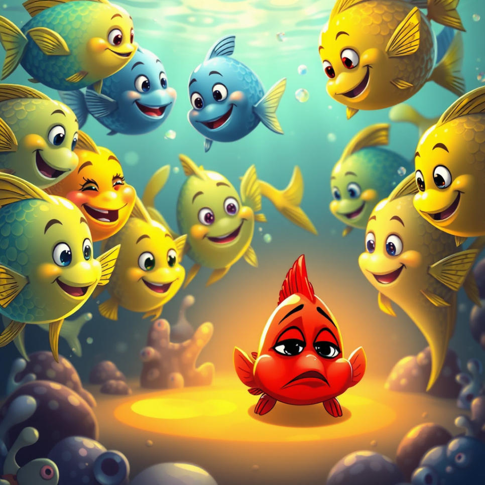 연못의 모든 친구들은 무리 지어 다니며 즐겁게 놀았지만, 붉은 물고기는 언제나 혼자였어요. 숨바꼭질을 할 때도, 맛있는 물풀을 찾으러 다닐 때도 늘 혼자였죠. 붉은 물고기는 자신이 왜 다른지 궁금했어요. "왜 나만 이런 색일까?" "나도 친구들과 똑같았으면 좋았을 텐데." 매일 밤, 붉은 물고기는 깜깜한 연못 바닥에 앉아 혼자만의 시간을 보냈습니다. 밝고 반짝이는 비늘이 오히려 외로움을 더 크게 만들었죠.