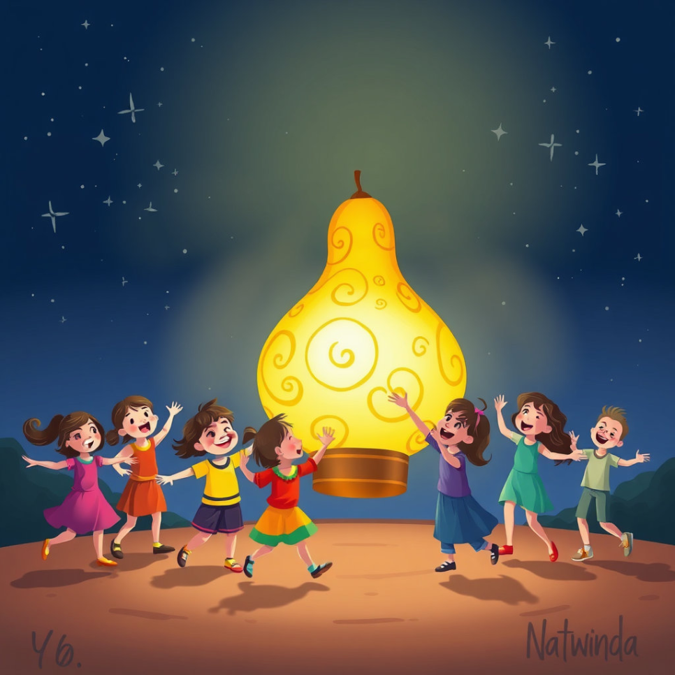 축제가 끝난 어느 날 밤, 아이들은 놀라운 광경을 보았어요. 지붕 위 남아 있던 박들이 하나둘 빛나며 하늘로 올라가더니, 별자리처럼 반짝였던 거예요. 아이들은 손을 흔들며 “안녕, 우리 박들아!” 하고 외쳤지요. 하늘에 걸린 박 그림들은 밤마다 마을을 내려다보며 환하게 비춰 주었어요. 그렇게 마을은 늘 빛과 웃음으로 가득했답니다.
