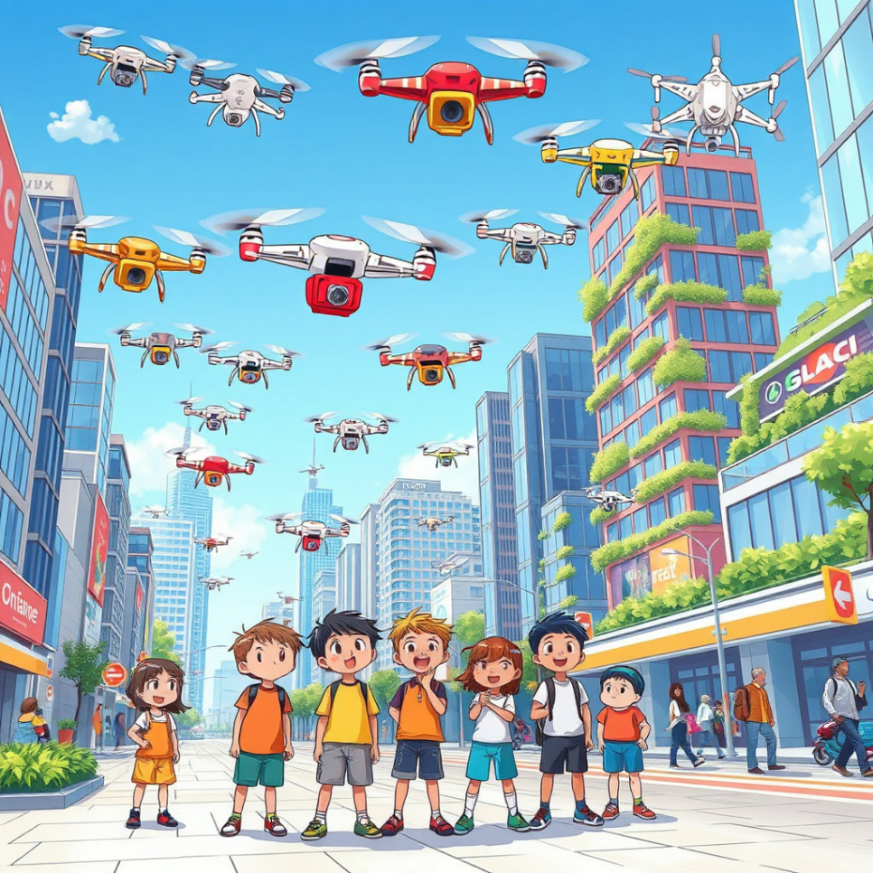 미래 도시에서는 하늘을 날아다니는 드론이 참 많았어요. 택배 드론은 물건을 실어 나르고, 청소 드론은 길거리를 깨끗하게 만들고, 안내 드론은 길을 잃은 사람을 도와주었어요. 민호는 하늘을 가득 메운 드론들을 보며 “우와, 마치 하늘에 드론 나라가 생긴 것 같아!” 하고 감탄했지요. 미래의 도시는 드론 덕분에 더 편리하고 깨끗했답니다.