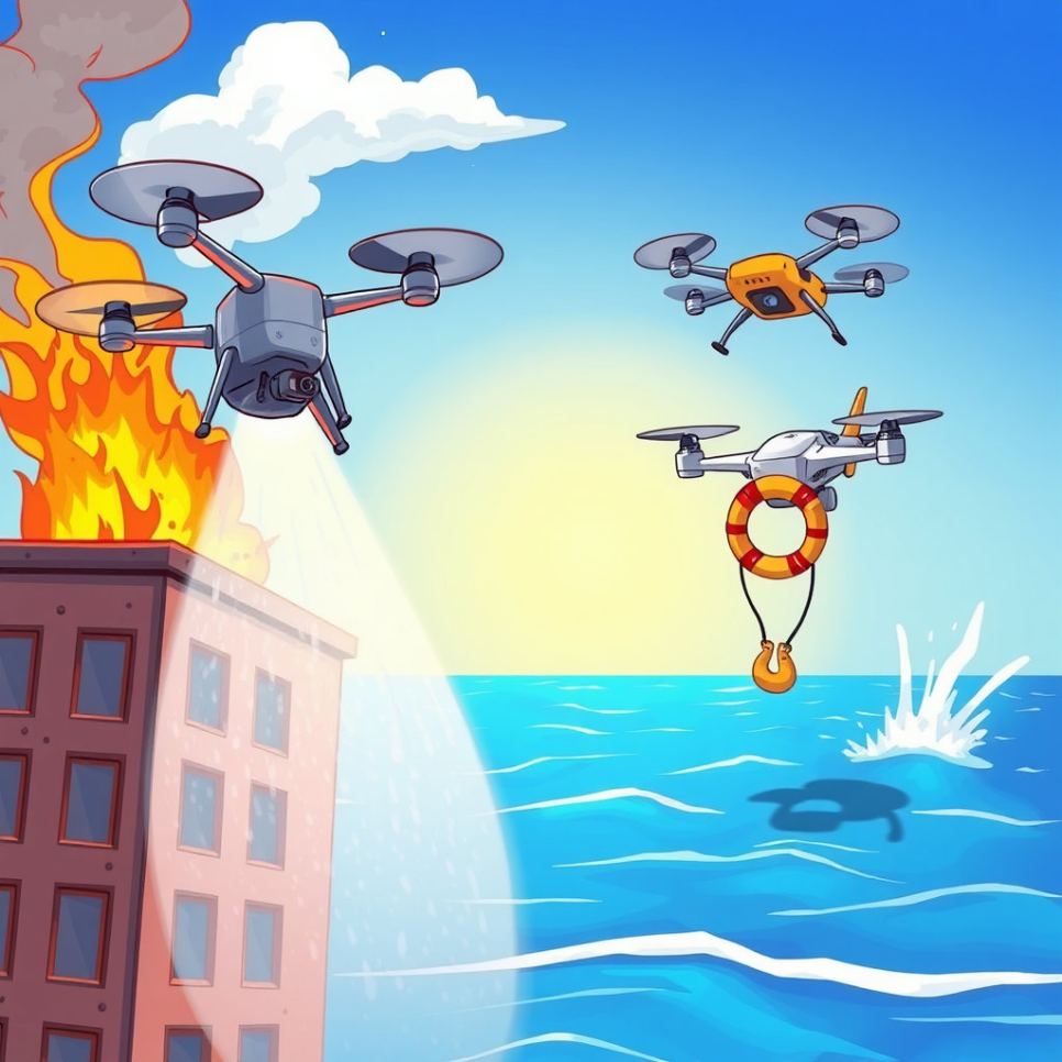 큰 불이 난 마을에 연기가 가득 퍼졌어요. 소방차가 도착했지만 안쪽까지 들어가기 어려웠지요. 그때 드론이 나타나 연기 속을 날아다니며 안에 있는 사람들을 찾아내 주었어요. 또 어떤 드론은 위에서 물을 뿌려 불길을 막기도 했지요. 민호는 드론이 위험한 곳에서도 용감하게 날아다니는 걸 보며 속으로 외쳤어요. “드론은 진짜 히어로야!”