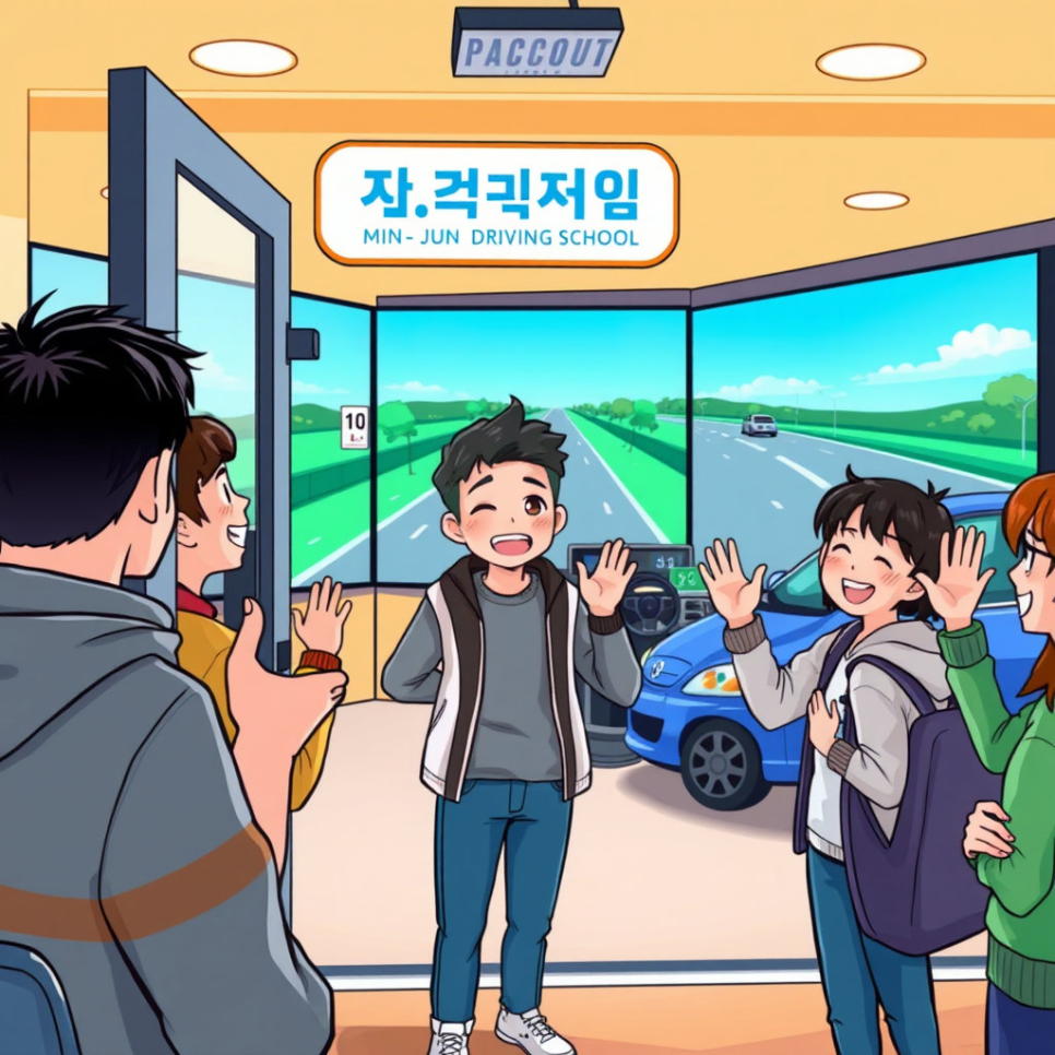 시험 날 전, 친구들과 마지막 연습! 서로 교대로 운전하며 작은 실수를 고쳐주고, 성공할 때마다 서로 박수를 쳤어요. 민준이는 친구와 함께 성장하는 기쁨을 느꼈답니다.