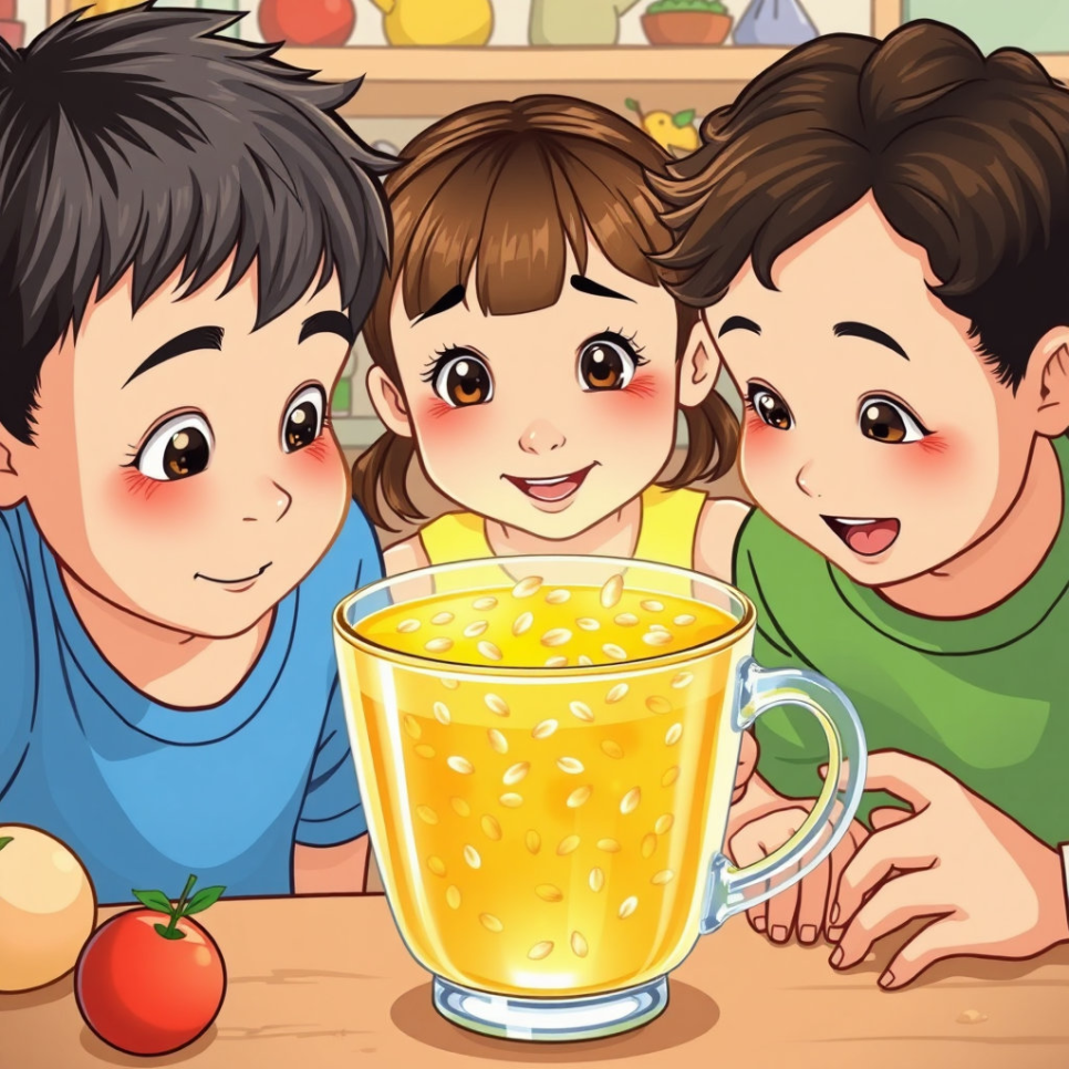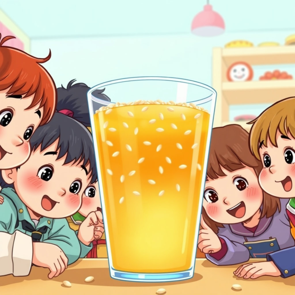 컵 속에는 하얀 밥알들이 동동 떠 있었어요. “이거 뭐야?” 아이가 묻자 엄마는 웃으며 대답했어요. “밥알이 식혜 안에서 친구처럼 둥둥 떠 있는 거야.” 밥알이 떠다니는 모습이 꼭 작은 배들이 물 위를 떠다니는 것 같았어요. 아이들은 밥알 하나하나를 먹으며 즐거워했지요.