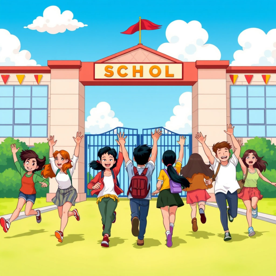 학교로 향하는 길, 친구 수아와 민준이는 서로를 격려하며 달린다. “오늘 모의고사 잘 봐보자!” 긴장된 표정이지만 서로의 눈빛에는 힘이 있다. 교문을 지나면서 민준이는 마음속으로 외친다. “나는 할 수 있어.” 발걸음마다 작은 결심이 쌓인다.