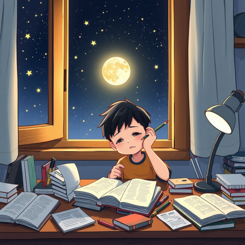 집에 돌아온 민준이는 책상 앞에서 눈을 비비며 공부한다. 피곤하지만 포기할 수 없다. 창밖에는 달빛이 비치고, 민준이는 속으로 다짐한다. “오늘 내가 한 노력은 내일의 나를 만든다.”