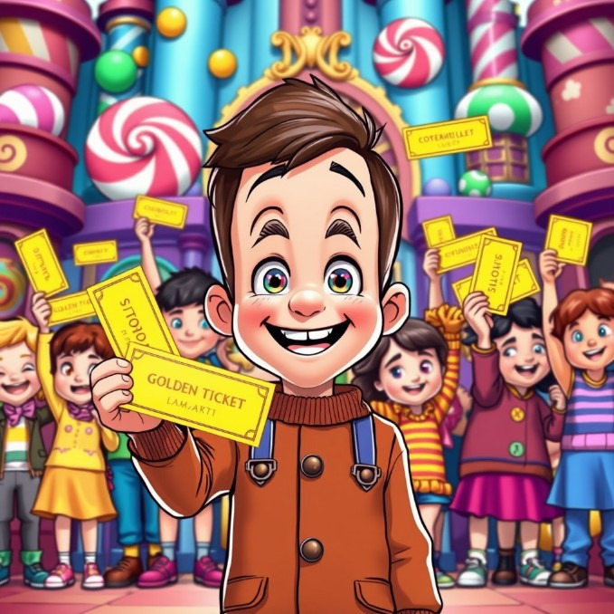 어느 날, 윌리 웡카는 자신이 만든 초콜릿에서 특별한 황금 티켓 5개를 숨겨두었다고 발표했어요. 이 티켓을 찾은 사람들은 공장 안으로 초대받을 수 있었죠! 찰리는 황금 티켓을 찾고 싶은 마음에 매일 초콜릿을 사 먹었어요. 하지만 그의 가난한 가족에게는 많은 초콜릿을 사기 어려운 일이었죠. 그런데 어느 날, 기적처럼 찰리는 마지막 한 조각 초콜릿에서 황금 티켓을 찾게 되어요!