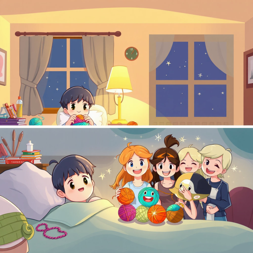 다른 실들은 걱정스러운 표정으로 파랑실을 바라보았어요. 미루 요정은 파랑실을 조심스럽게 털실 병원으로 데려갔죠. 병원에는 작은 바늘과 튼튼한 실 조각들이 있었어요. 미루는 아주 작은 바늘로 파랑실의 끊어진 부분을 정성껏 이어붙였어요. 친구들도 옆에서 "힘내, 파랑실!" 하고 응원했죠. 비록 작은 실 조각이지만, 모두가 힘을 모아 아픈 친구를 돕는 따뜻한 마음이 가득한 순간이었답니다.