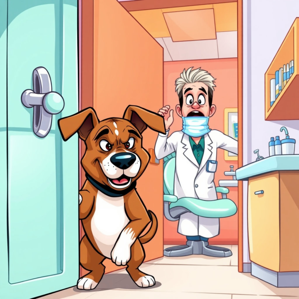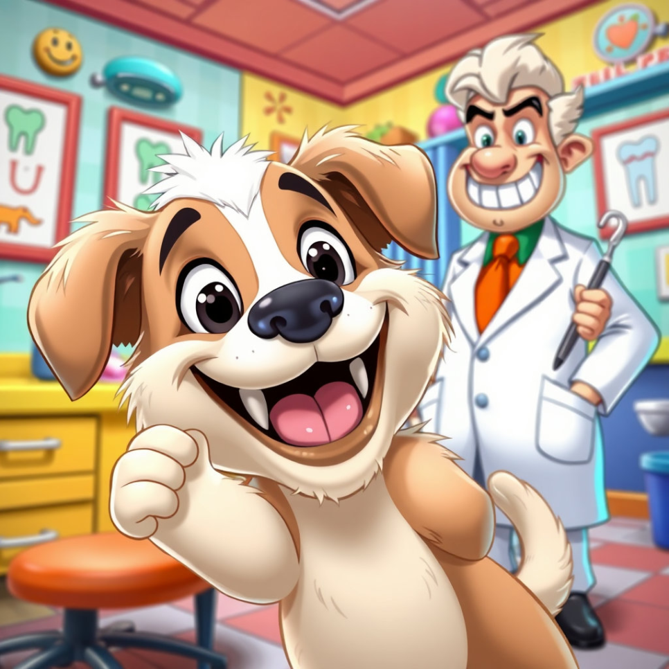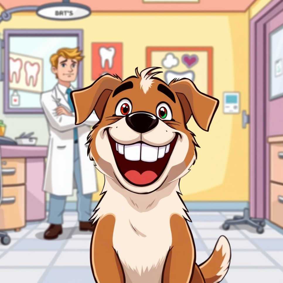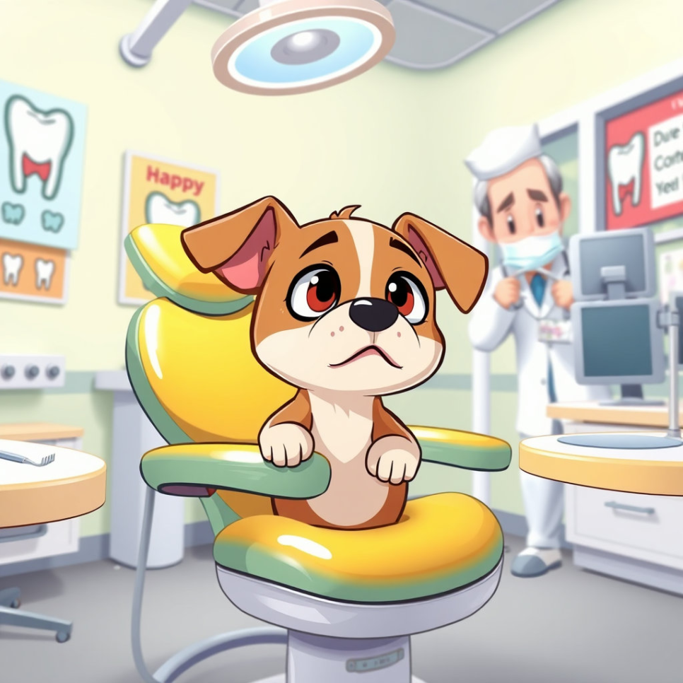 하지만 며칠 뒤, 왈왈이는 딱딱한 사탕을 너무 신나게 깨물어 먹다가 앞니 하나가 살짝 흔들리는 것을 느꼈어요. "어, 앙돼!" 깜짝 놀란 왈왈이는 흔들리는 이빨을 혀로 톡톡 건드려 보았죠. 점점 더 불안해진 왈왈이는 결국 동네 새로운 치과를 찾아갔어요. 치과의사는 왈왈이를 보더니 콧수염을 쓰윽 쓸어 올리며 친절한 목소리로 말했습니다. "어이쿠, 꼬마 손님. 이빨이 조금 흔들리는군요? 자, 어서 이쪽으로 와서 한번 봅시다." 왈왈이는 긴장된 마음으로 치과 의자에 앉았답니다.