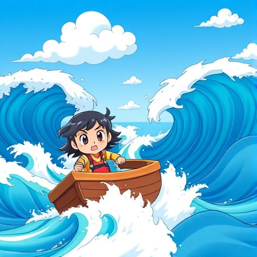 모모는 할머니, 할아버지와 작별을 한 뒤 요괴섬으로 향하기로 결심했어요. 작은 배를 타고 바다를 건너며, 모모는 처음 느껴보는 두려움과 설렘을 동시에 느꼈답니다. 바람이 세차게 불었지만, 모모의 눈빛은 흔들리지 않았어요.