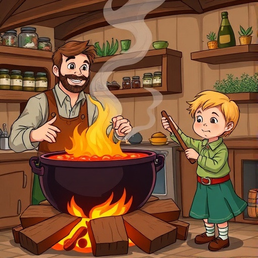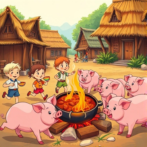 해가 밝으면 아버지는 마당의 큰 솥에 불을 지폈어요. 장작을 넣고 불꽃이 일렁이자, 모아 둔 음식 찌꺼기를 한꺼번에 넣었지요. 김이 모락모락 피어나며 꿀꾸리죽이 끓어올랐어요. 마을 어귀에서는 벌써 돼지들의 "꿀꿀꿀!" 소리가 들려왔답니다. 아이들은 숟가락을 들고 보글보글 끓는 죽을 휘저으며 웃었어요. “이건 돼지의 아침밥!”