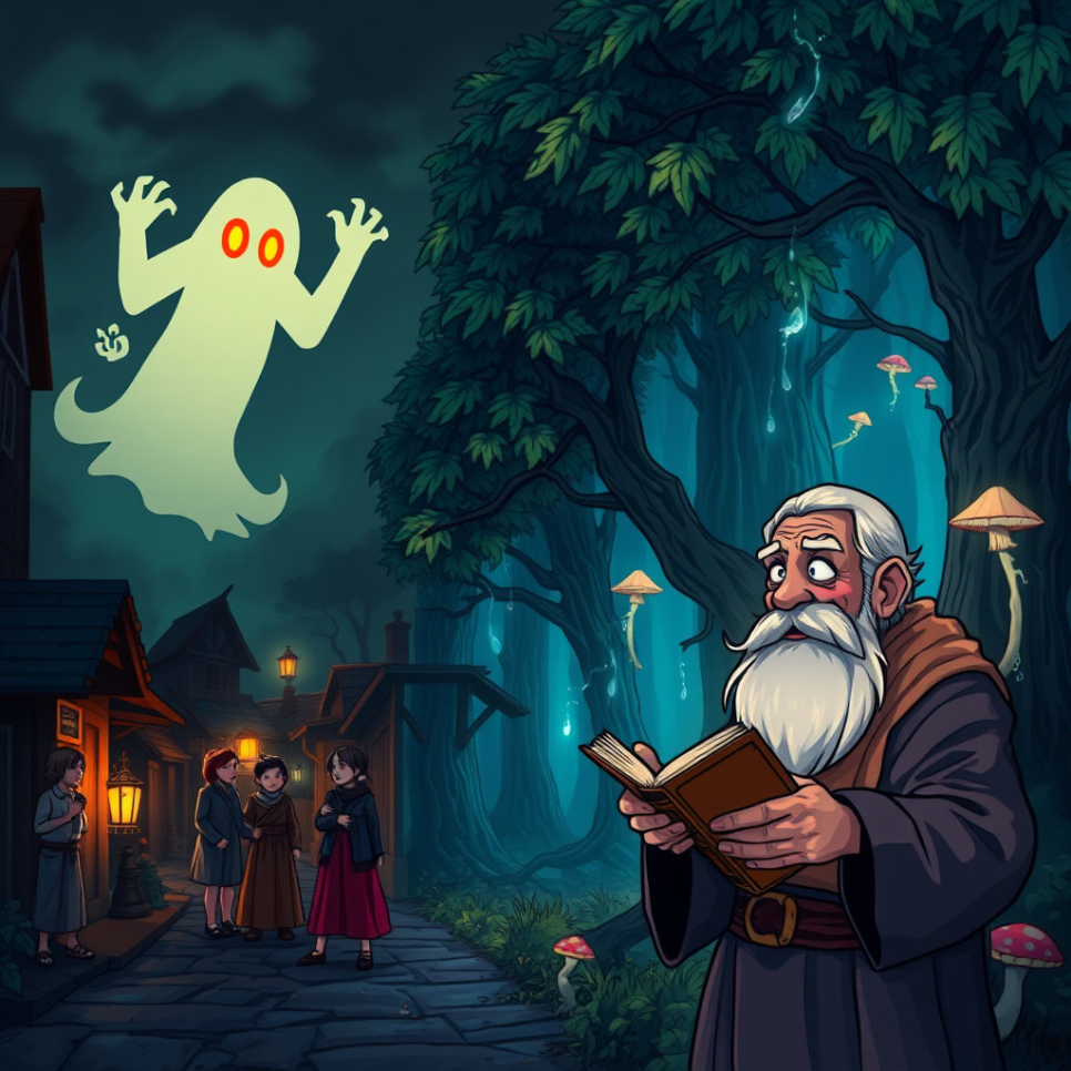 히로시가 숲 속에서 지혜로운 노인과 대화하는 장면. 노인은 손으로 책을 들고 강시의 비밀을 히로시에게 전하며, 배경은 신비로운 숲 속 풍경입니다.