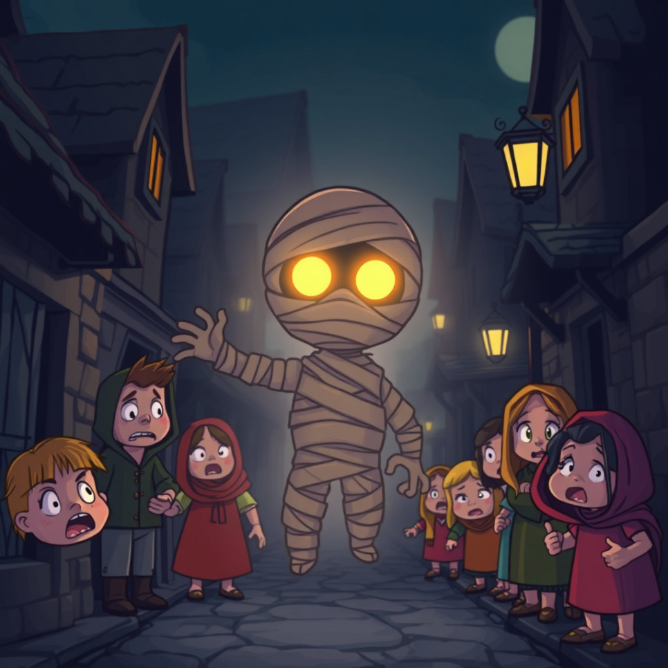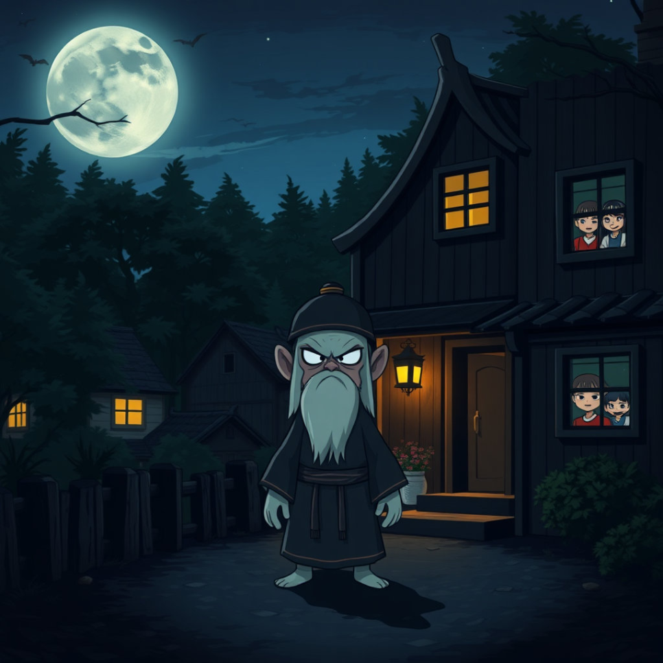 한밤중, 마을을 떠도는 어두운 그림자가 나타나 사람들을 두렵게 만들고 있었어요. 그것은 강시라는 전설 속의 존재였어요. 강시는 죽은 사람의 영혼이 원한을 품고 살아 돌아오는 특별한 존재랍니다. 마을 사람들은 강시를 보지 않으려 밤마다 조심했어요.