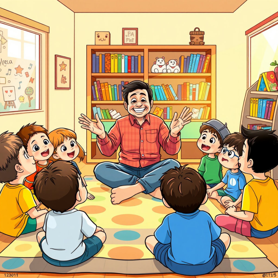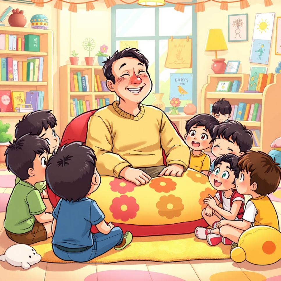 히로시가 어린 아이들에게 자신의 경험을 이야기하는 장면. 아이들은 눈을 반짝이며 히로시의 말을 듣고 있고, 히로시는 따뜻한 미소로 그들에게 교훈을 전합니다.