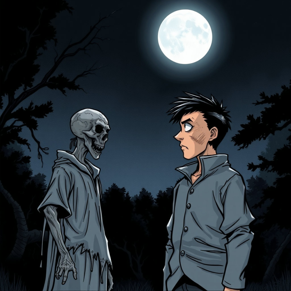 히로시는 마침내 강시와 마주쳤어요. 강시는 분노와 슬픔이 섞인 표정으로 히로시를 노려보았어요. 히로시는 강시에게 원한을 풀어주지 않으면 마을이 계속 고통받을 것이라며 이야기를 시작했어요. 강시는 과연 그의 말을 들을까요?