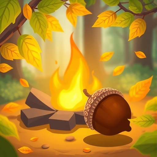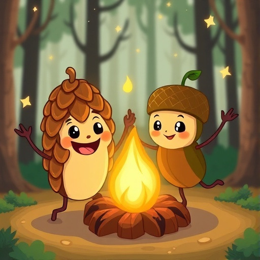 민호가 조심스럽게 도토리 껍질을 올리자, 불꽃은 춤을 추며 따뜻하게 피어났죠. 밤나무 잎은 바람에 흔들리며 은은한 향기를 내뿜었어요.