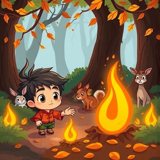 숲 속 깊은 곳, 작은 아이 민호는 따뜻한 모닥불을 피우고 싶었어요. 그런데 불씨는 어디서부터 시작해야 할지 몰랐죠. 그때 바삭바삭 소리를 내며 마른 잎 마루가 나타났어요.