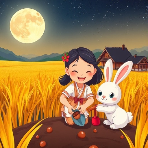 한가위가 다가오자, 시골 마을은 황금빛으로 물들었어요.