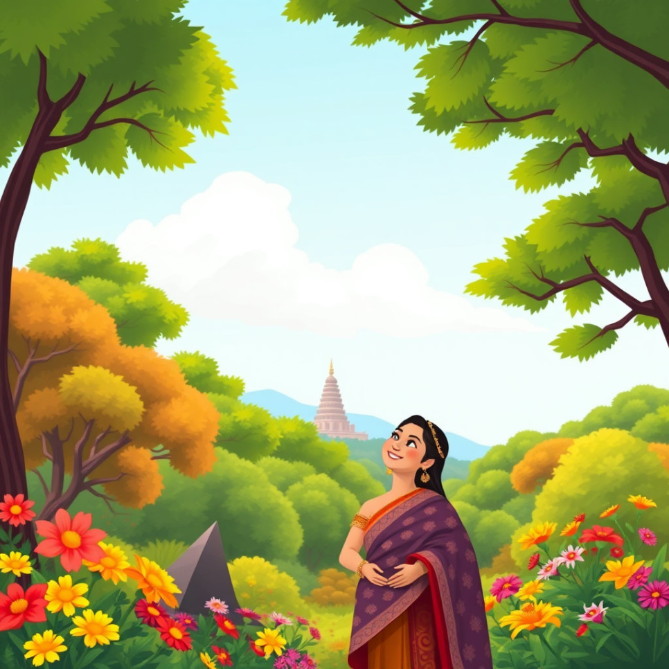 마야 왕비는 매일 아침 맑은 물로 몸을 깨끗이 하고, 아름다운 꽃들에게 인사를 건네며 순산을 기원했어요. 동산의 모든 풀잎과 꽃들도 왕비의 착한 마음을 아는지, 더욱 싱그럽게 빛나는 듯했습니다. 왕과 왕비의 따뜻한 마음은 룸비니 동산 전체에 평화로운 기운을 감돌게 했고, 사람들은 왕비의 순산을 함께 기다리며 축복했답니다. 마치 봄을 기다리는 씨앗처럼, 룸비니 동산은 곧 태어날 아기를 맞이할 준비를 하며 설렘으로 가득 차 있었어요.